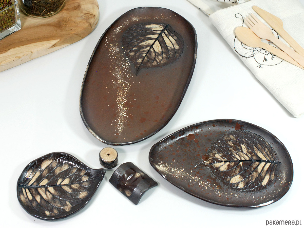 Wyjątkowy, ręcznie wykonany zestaw ceramiczny idealny do serwowania sushi, przystawek, tapas czy drobnych dań. W skład kompletu wchodzą trzy dekoracyjne misy w naturalnej, liściastej stylistyce oraz ceramiczny stojak na pałeczki lub łyżeczkę oraz stojak na kadzidełko. Zestaw doskonale sprawdzi się podczas rodzinnych kolacji, spotkań z przyjaciółmi czy jako oryginalna ozdoba kuchni i jadalni. To również świetny pomysł na prezent na ślub, urodziny czy nowe mieszkanie.