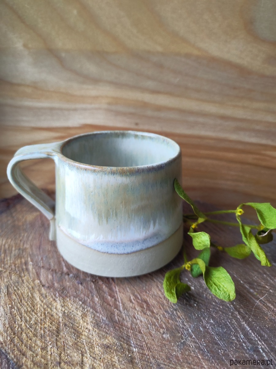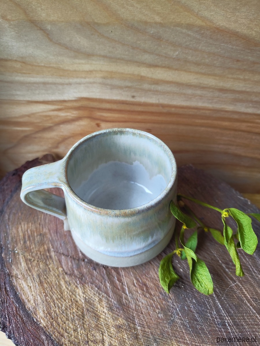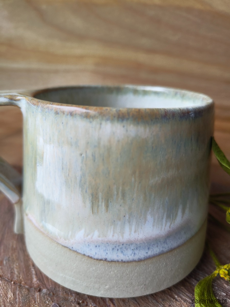 wykonany ręcznie, toczony na kole z białej gliny , szkliwiony mieszanką dwóch szkliw, co daje niepowtarzalny efekt ,