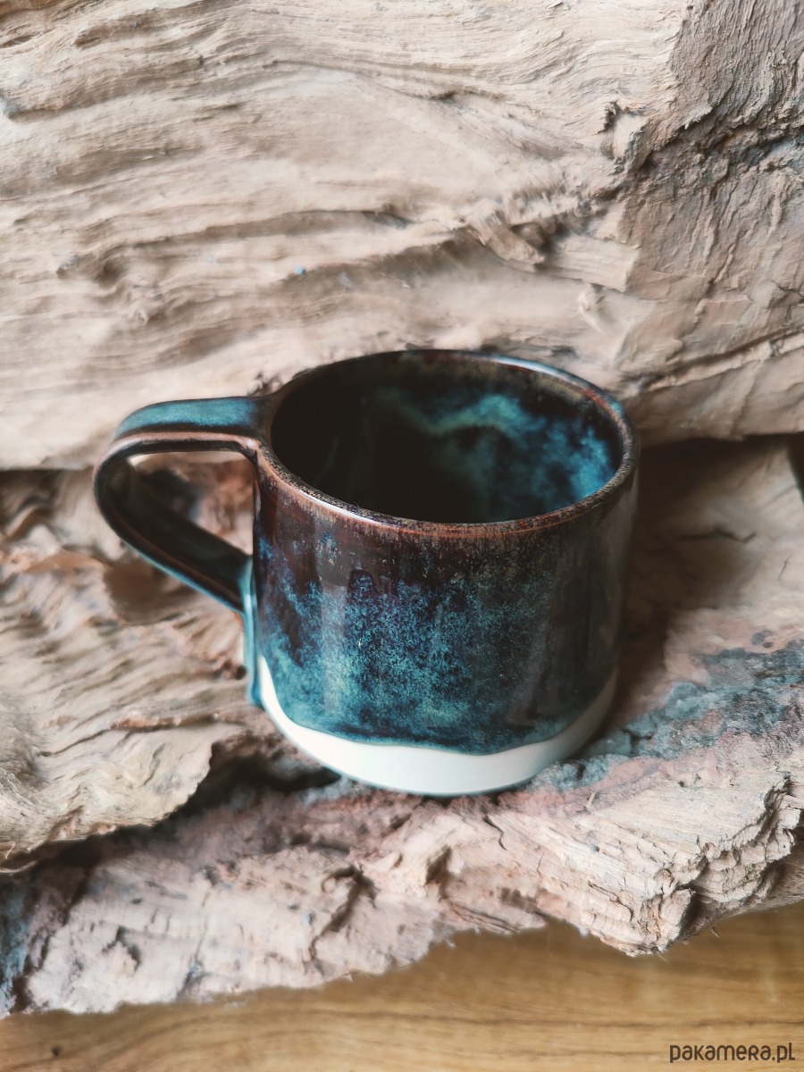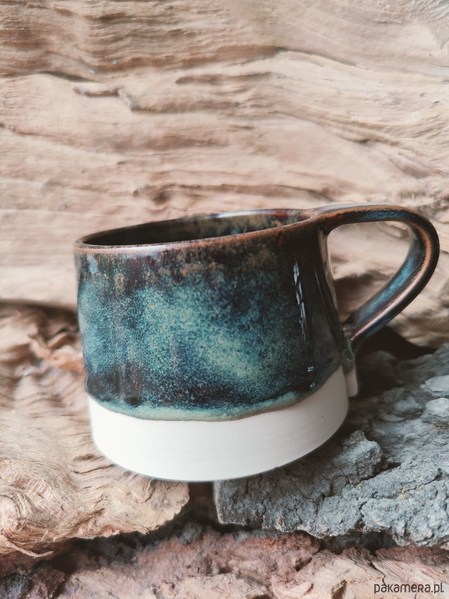 Ceramiczny kubek o pojemności 310 ml ,kubek wykonany ręcznie, toczony na kole z białej gliny ,szkliwiony szkliwem przeznaczonym do kontaktu z żywnością..