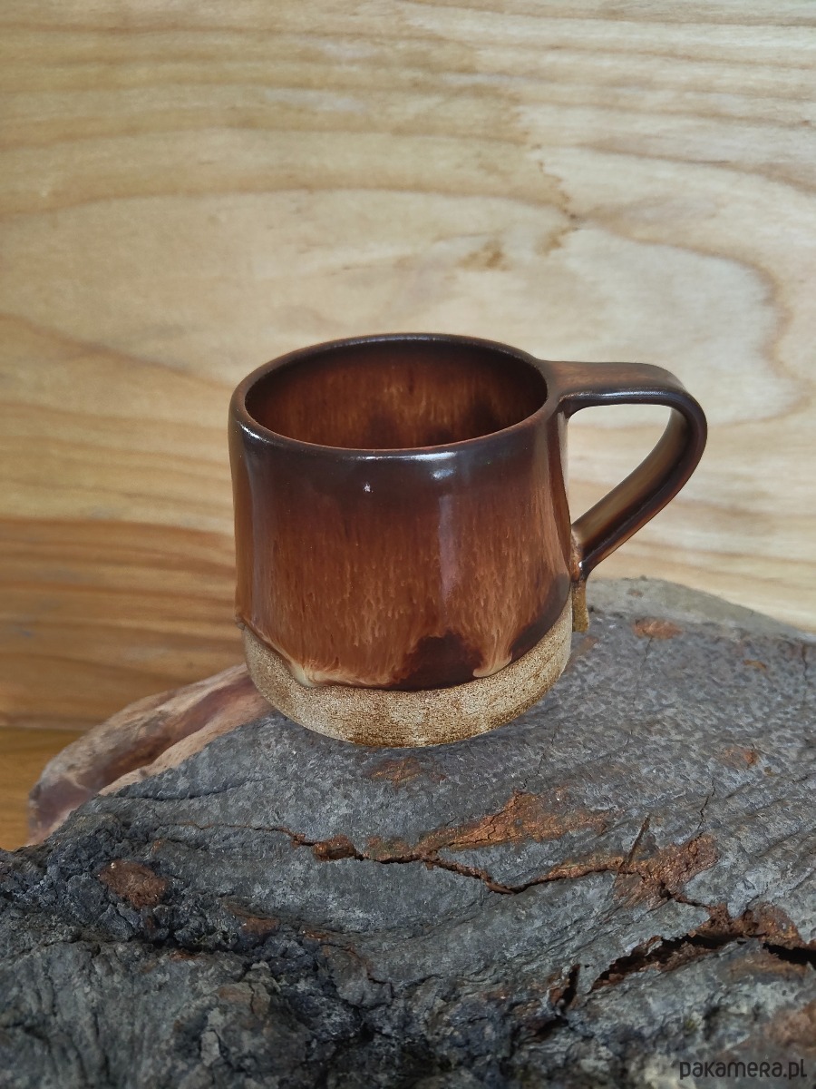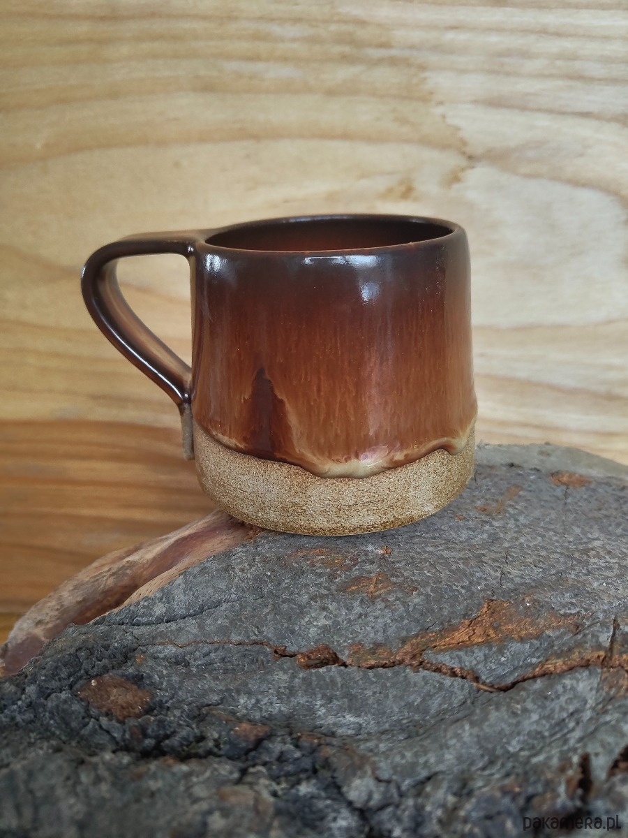 Kubek ceramiczny, ręcznie toczony na kole o pojemności 270ml . Wykonany z karmelowej gliny ", szkliwiony mieszanką szkliw przeznaczonych do kontaktu z żywnością.