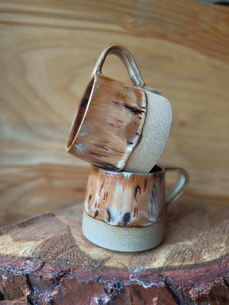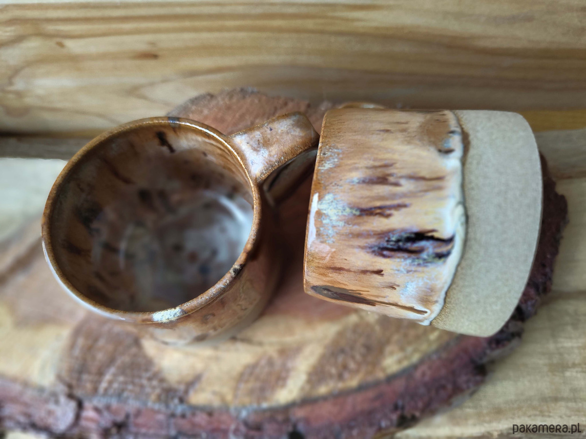 Kubek ceramiczny, ręcznie toczony na kole o pojemności 380ml . Wykonany z karmelowej gliny ", szkliwiony mieszanką szkliw przeznaczonych do kontaktu z żywnością.