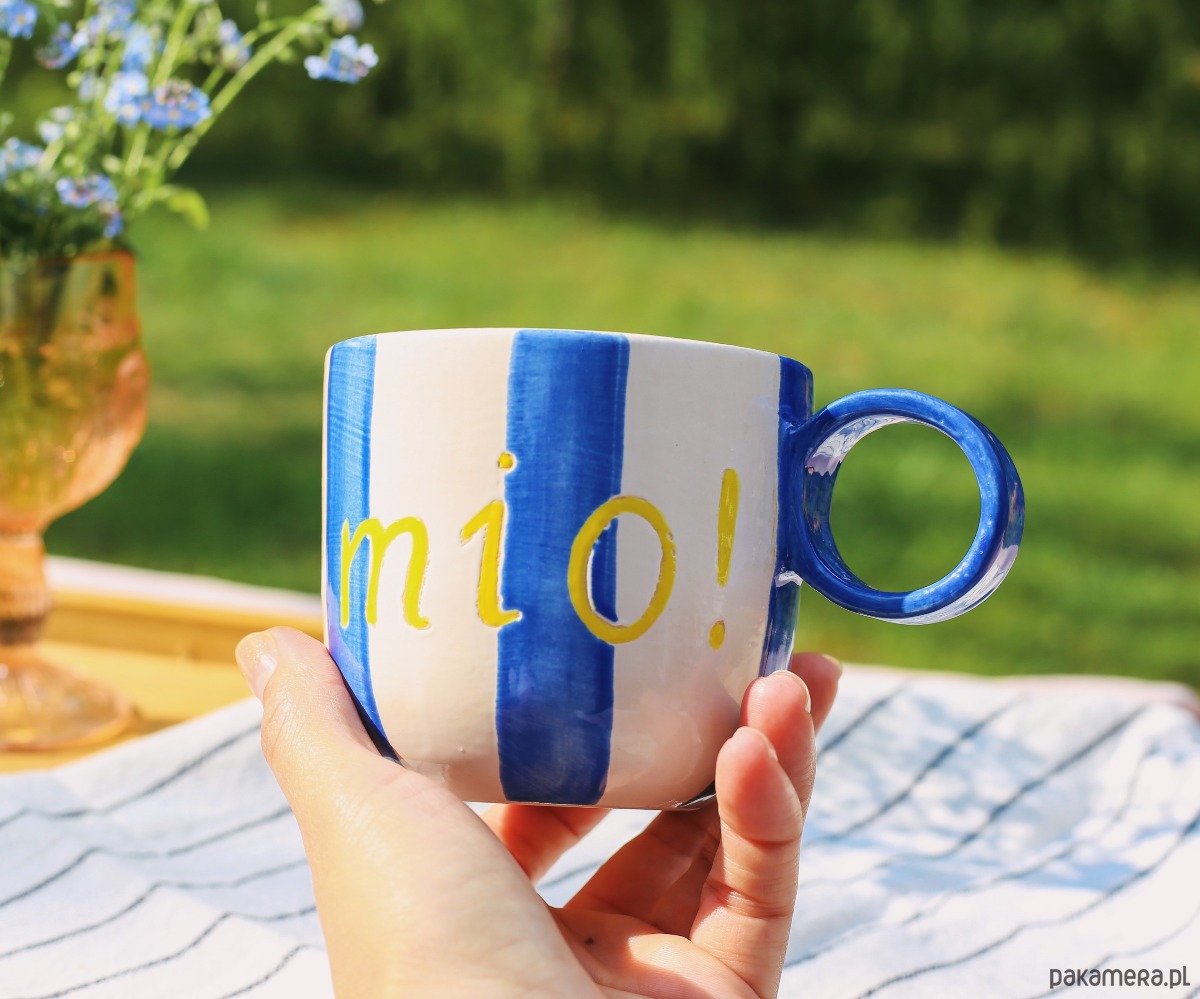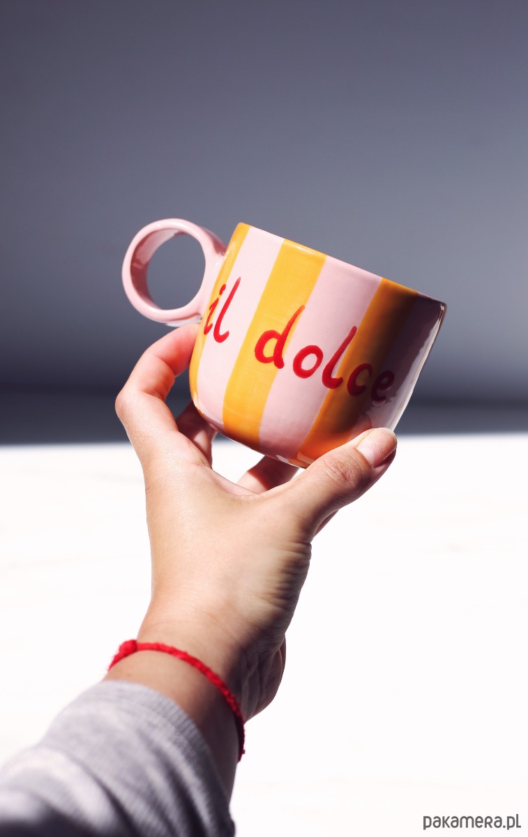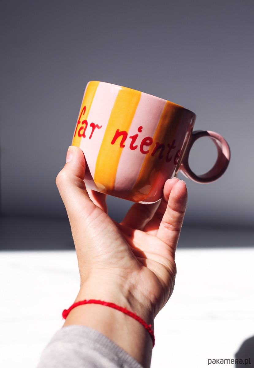 Kubek ceramiczny z włoskimi napisami O SOLE MIO! oraz DOLCE FAR NIENTE.