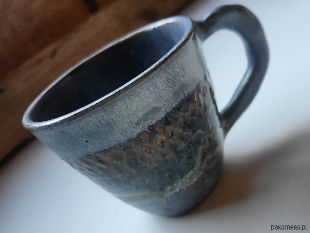 Toczony, ręcznie dekorowany ceramiczny kubek o pojemności 300 ml i wymiarach: