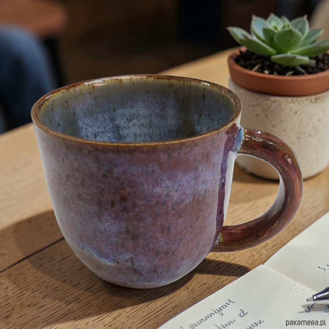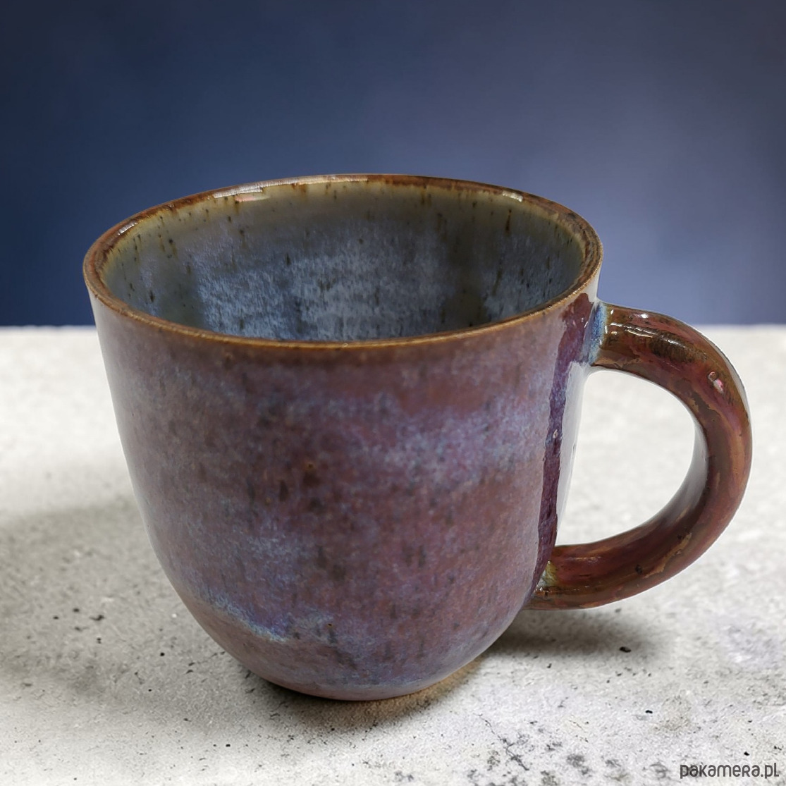 Toczony, ręcznie dekorowany ceramiczny kubek o pojemności prawie 350 ml i wymiarach: