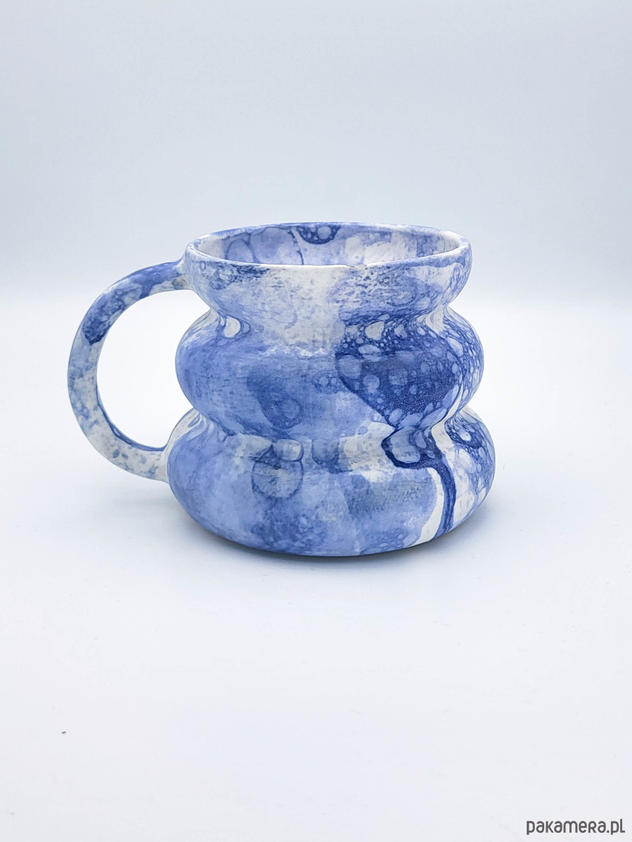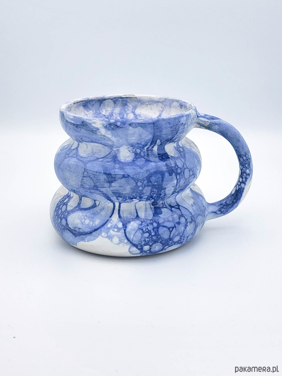 Ceramiczny kubek pokryty białym matowym szkliwem, dodatkowo zdobiony niebieską farbą naszkliwną. Zastosowane szkliwo jest bezpieczne do kontaktu z żywnością. Kubek można myć w zmywarce.
