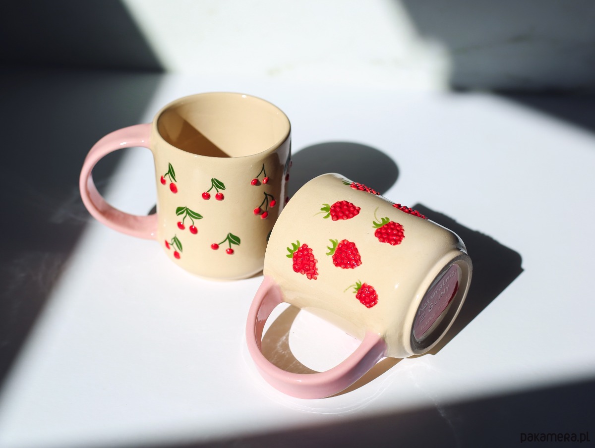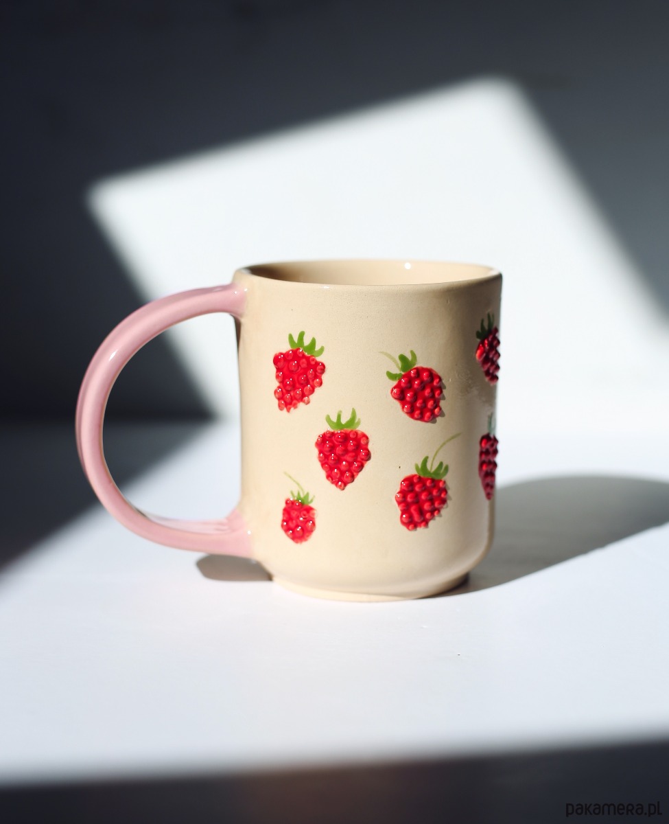 Kubek ceramiczny w odstające maliny. Ręcznie malowany.