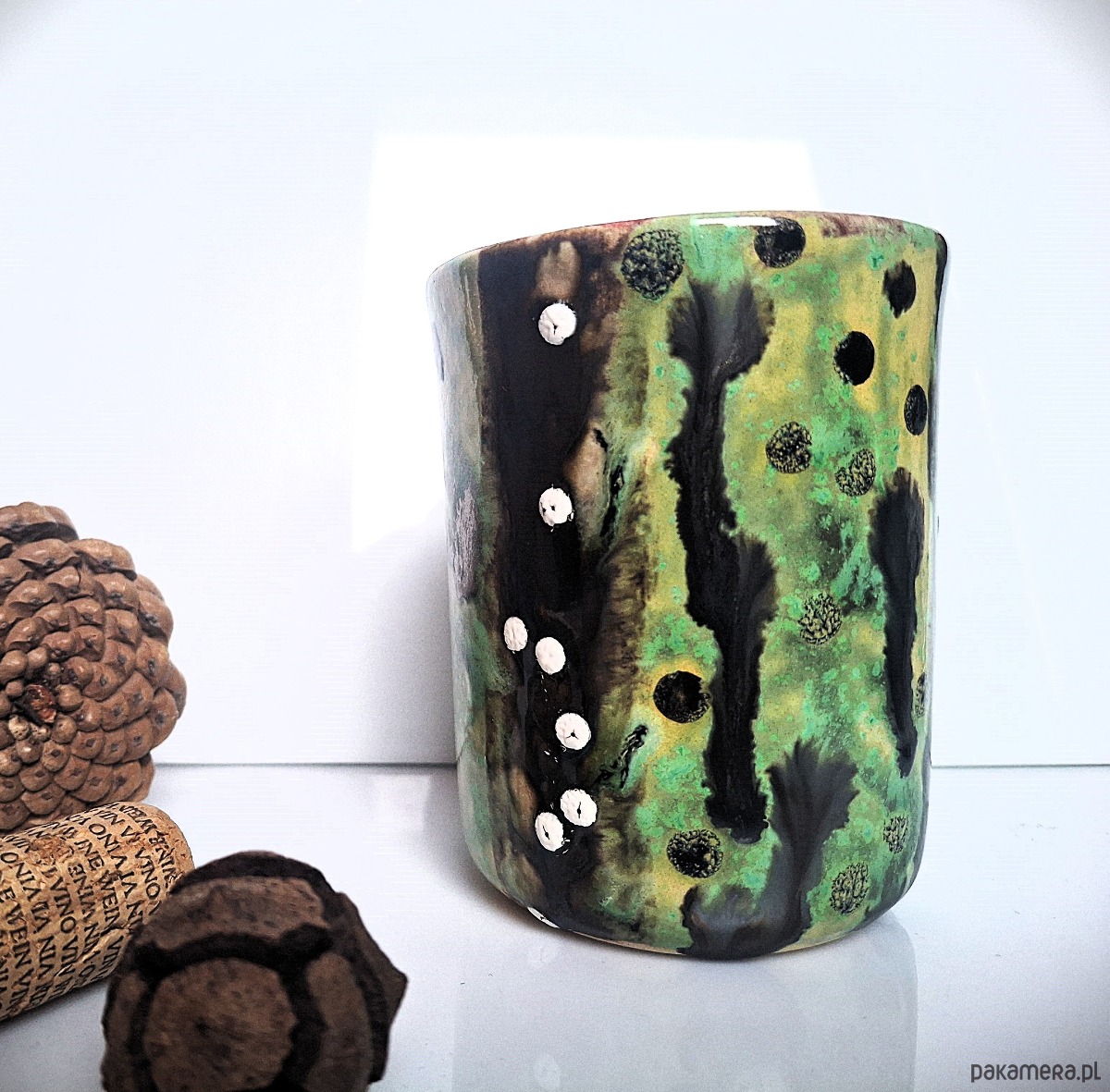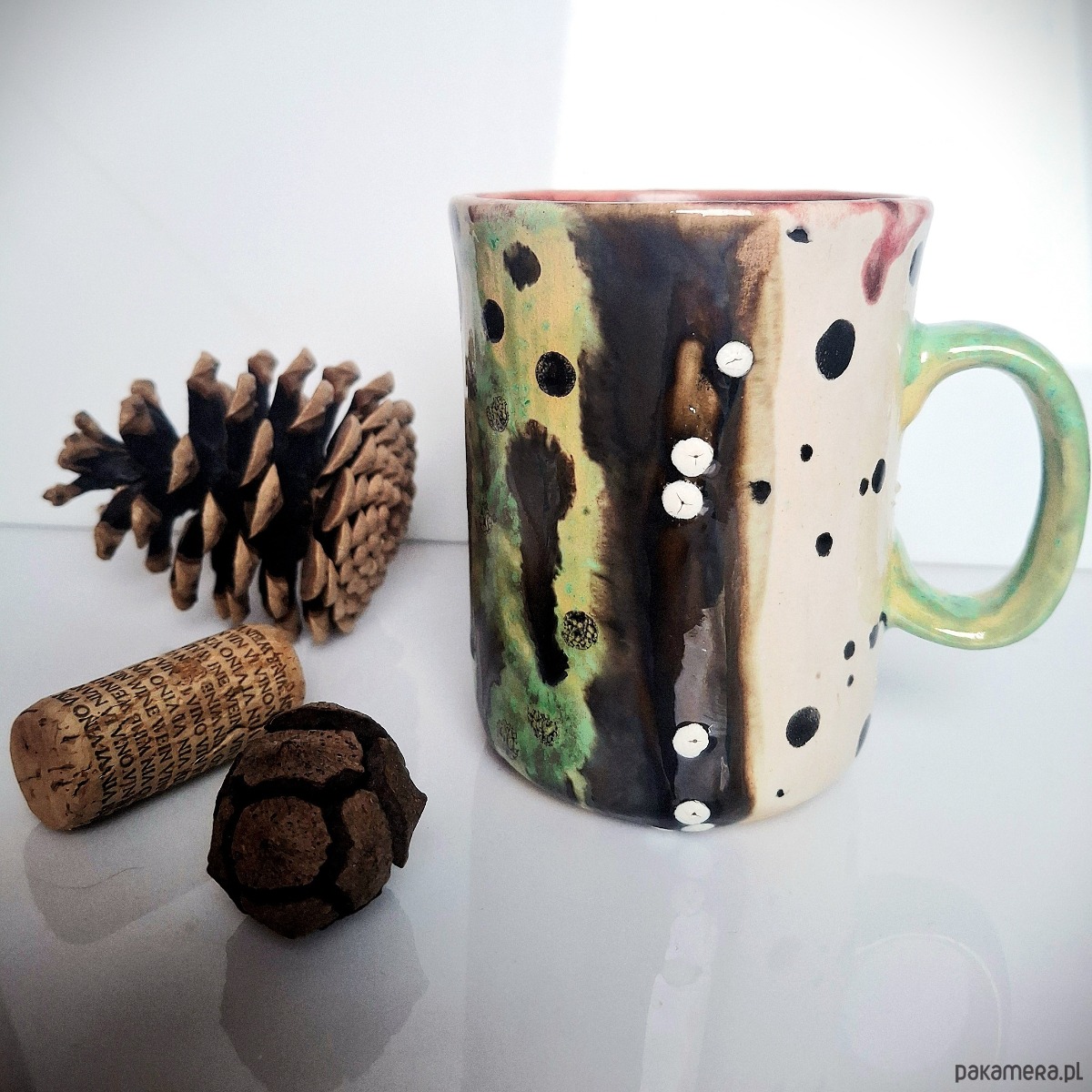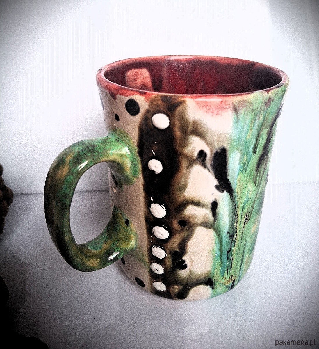 Kubek został ręcznie malowany i szkliwiony szkliwami marki Mayco posiadającymi certyfikat bezpieczeństwa oraz dopuszczenie do kontaktu z żywnością. Każdy etap powstawania został wykonany z dbałością o detal, trwałość i estetykę. To pojedynczy egzemplarz – niepowtarzalny i niemożliwy do odtworzenia w identycznej formie.