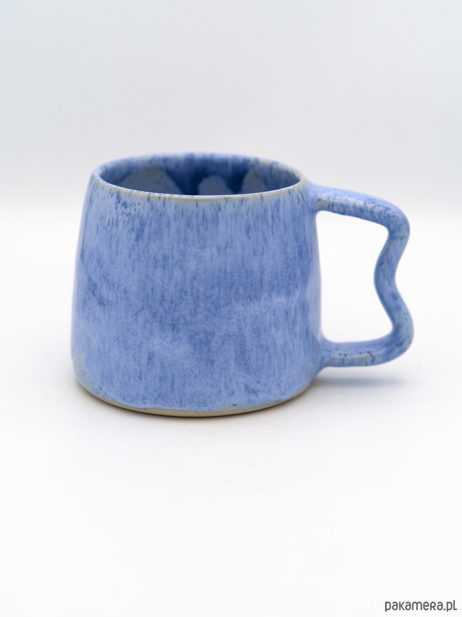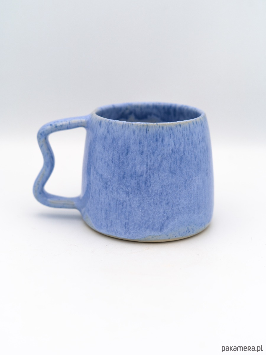 Ceramiczny kubek pokryty niebieskim szkliwem. Kubek posiada bardzo wygodne, faliste uszko. Zastosowane szkliwo jest bezpieczne do kontaktu z żywnością. Kubek można myć w zmywarce.