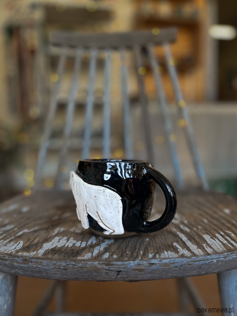 Ręcznie lepiony i szkliwiony kubek z autorską płaskorzeźbą niedźwiadka polarnego.