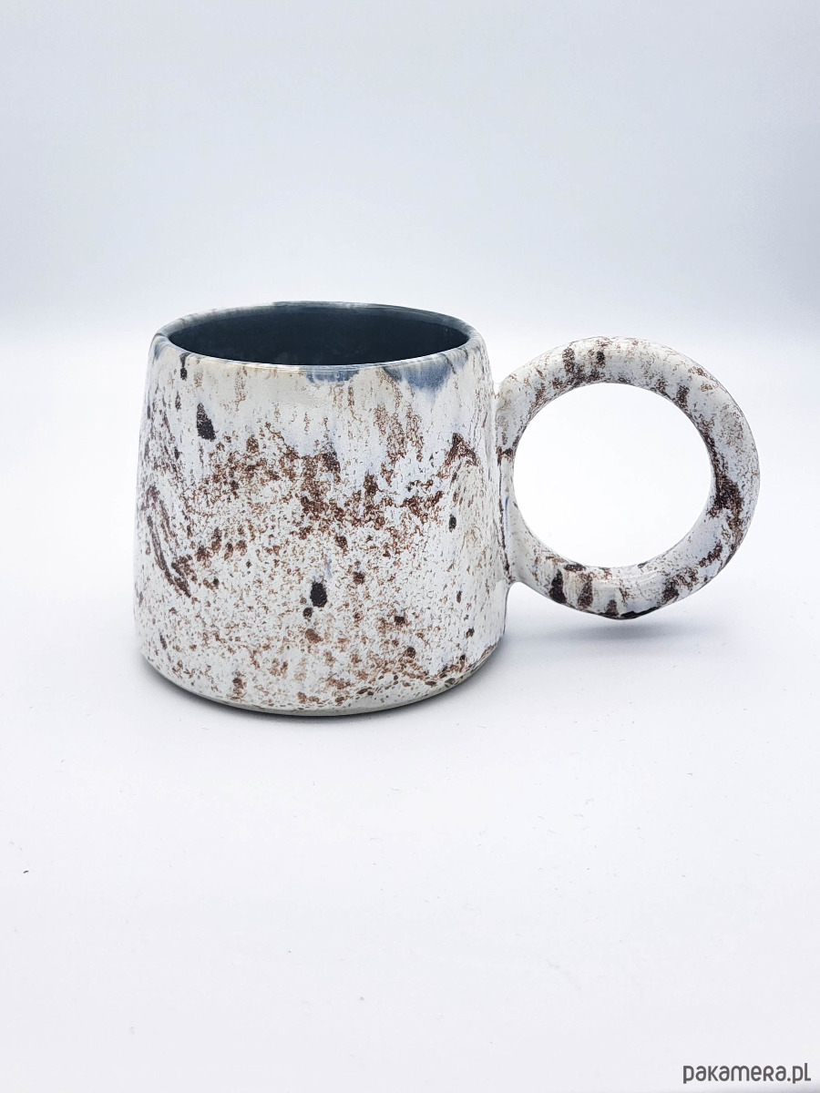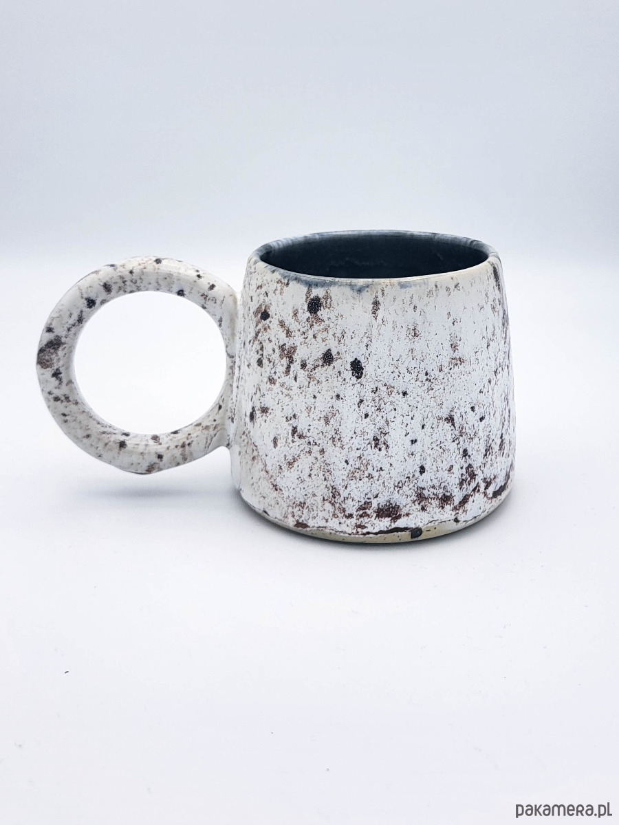Ceramiczny kubek pokryty białym błyszczącym szkliwem, nakrapiany czarnym kolorem. Wnętrze ciemnogranatowe. Bardzo wygodne okrągłe ucho. Zastosowane szkliwo jest bezpieczne do kontaktu z żywnością. Kubek można myć w zmywarce.