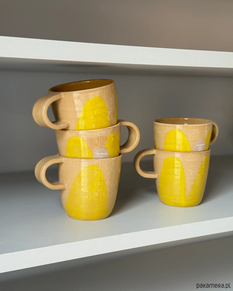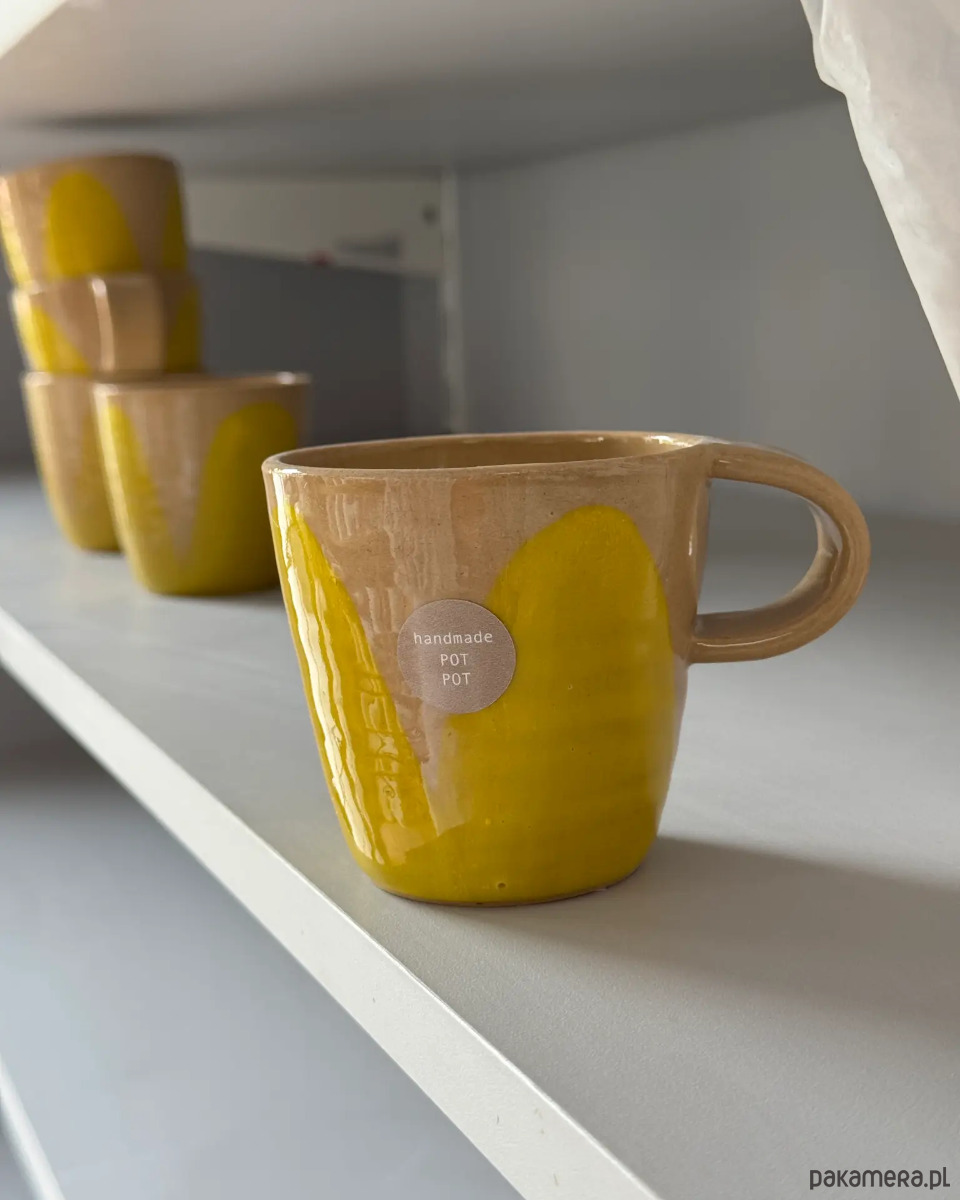 Każdy kubek powstaje w pracowni Pot Pot Shop w Bielsku-Białej, gdzie tradycja łączy się z pasją i starannością. Kubek wykonany jest ręcznie z jasnej gliny i pokryty autorskim szkliwem w ciepłym żółtym odcieniu, z delikatnymi przebarwieniami i naturalnymi nieregularnościami, które nadają mu niepowtarzalny vintage’owy urok.