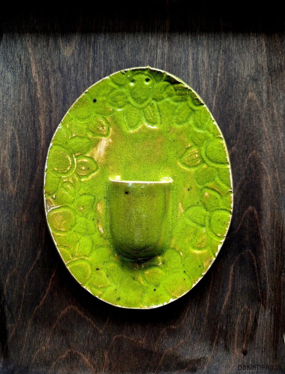 Ceramiczna zawieszka ścienna w żywym zielonym kolorze. Dekoracja w kwiatowe wzory, posiada okrągłą kieszonkę w której można umieścić kwiaty, świeczkę, zdjęcie. Możliwość zawieszenia na złotym sznureczku lub za pomocą dodatkowej zawieszki. Ozdoba ręcznie formowana i szkliwiona.