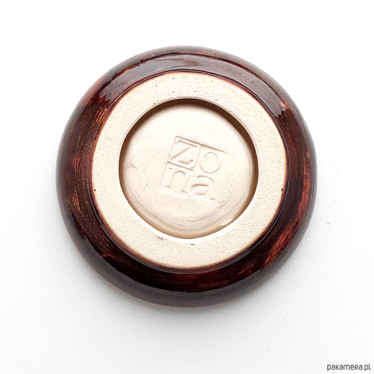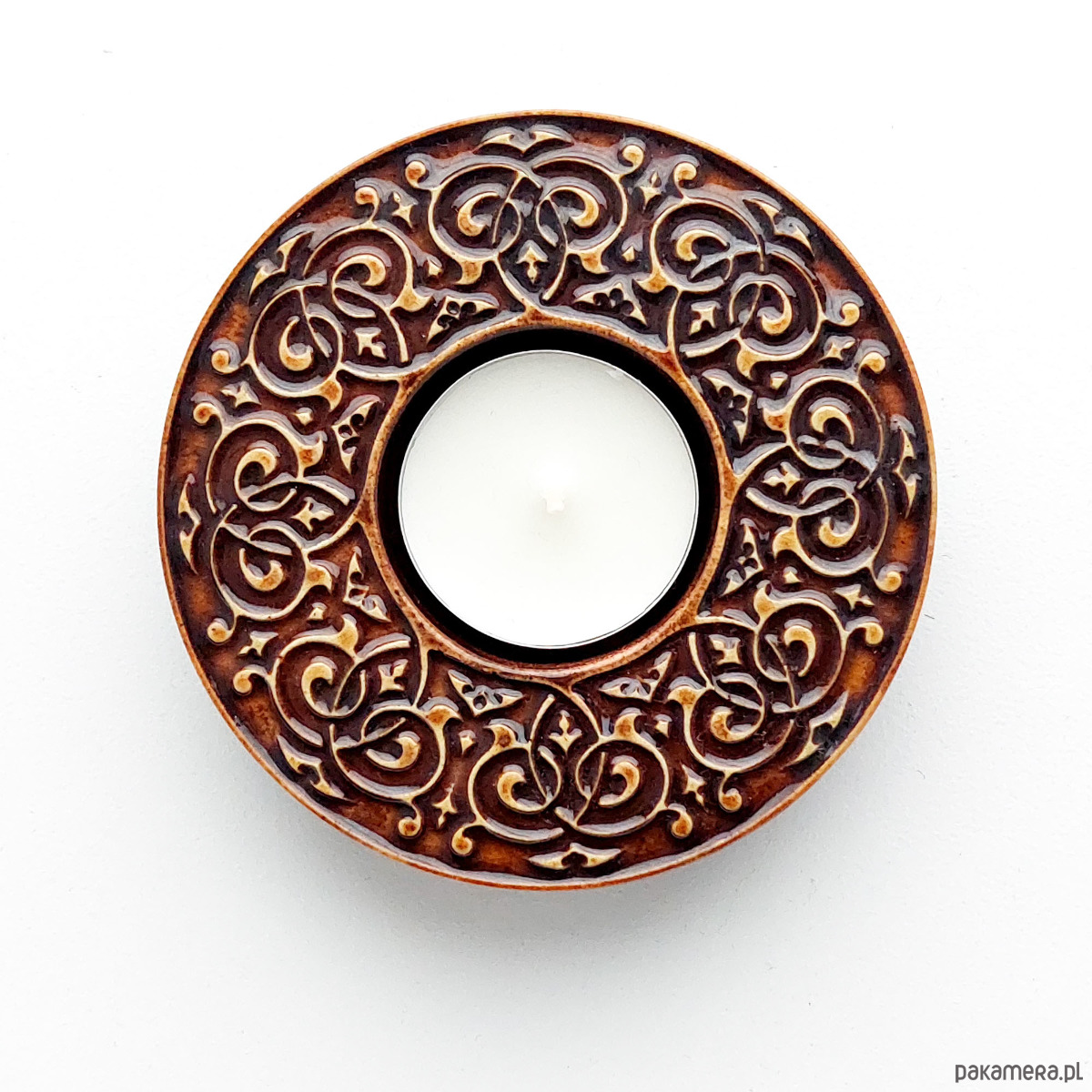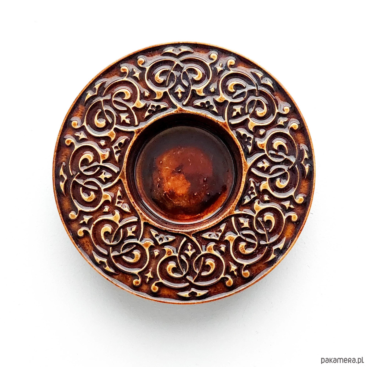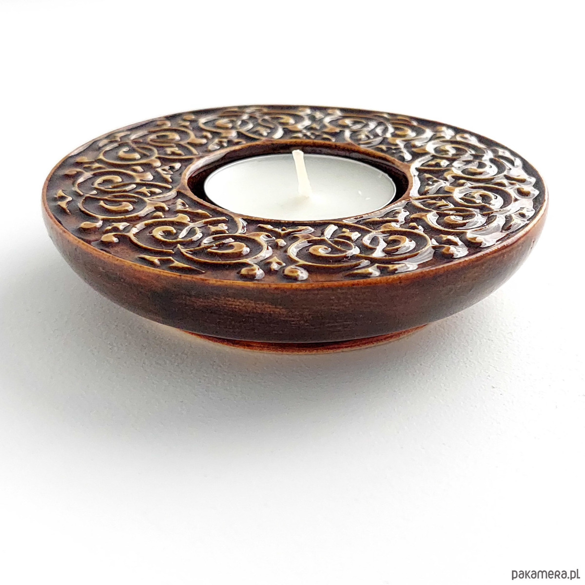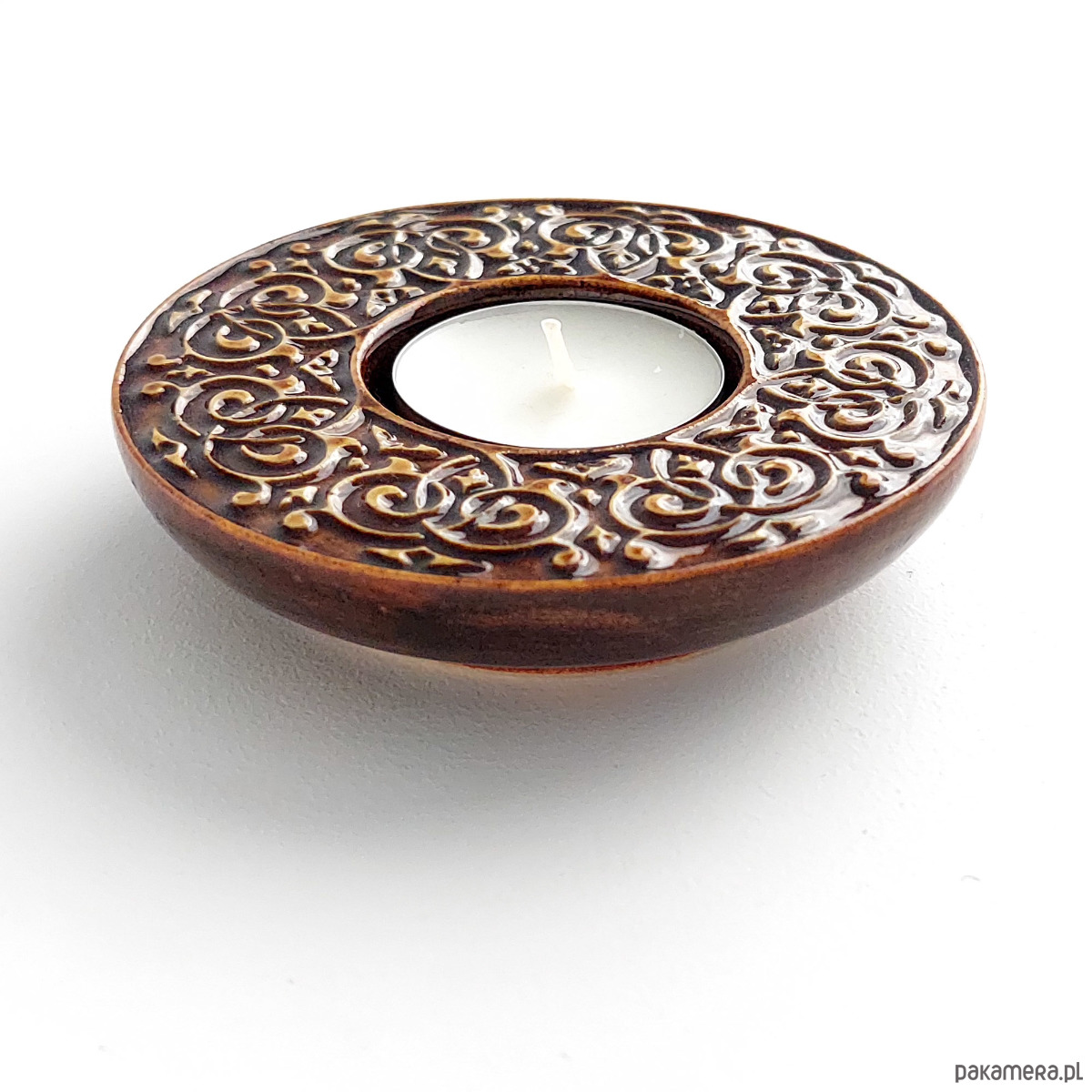 Ceramiczny lampion (świecznik) z misternym, lekko wypukłym ornamentem. Wykonany z jasnej gliny, pokryty błyszczącym szkliwem. Od spodu sygnowany. Polecam serdecznie.