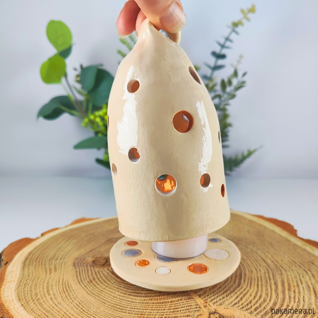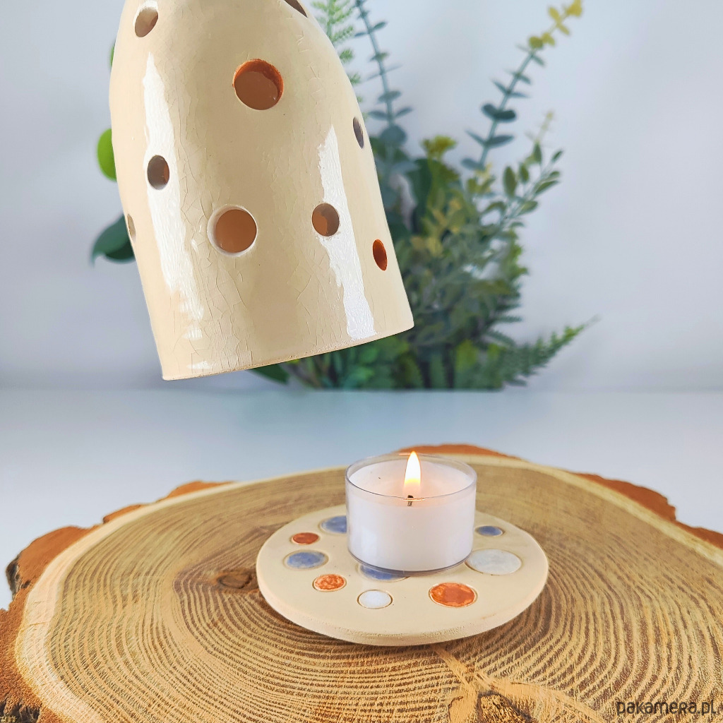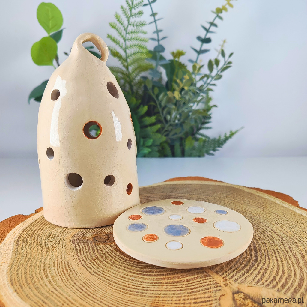 Ręcznie lepiony, ceramiczny lampion z jasnej gliny. Kropki na podstawce w kolorach: biały, niebiesko-szary, rudy.