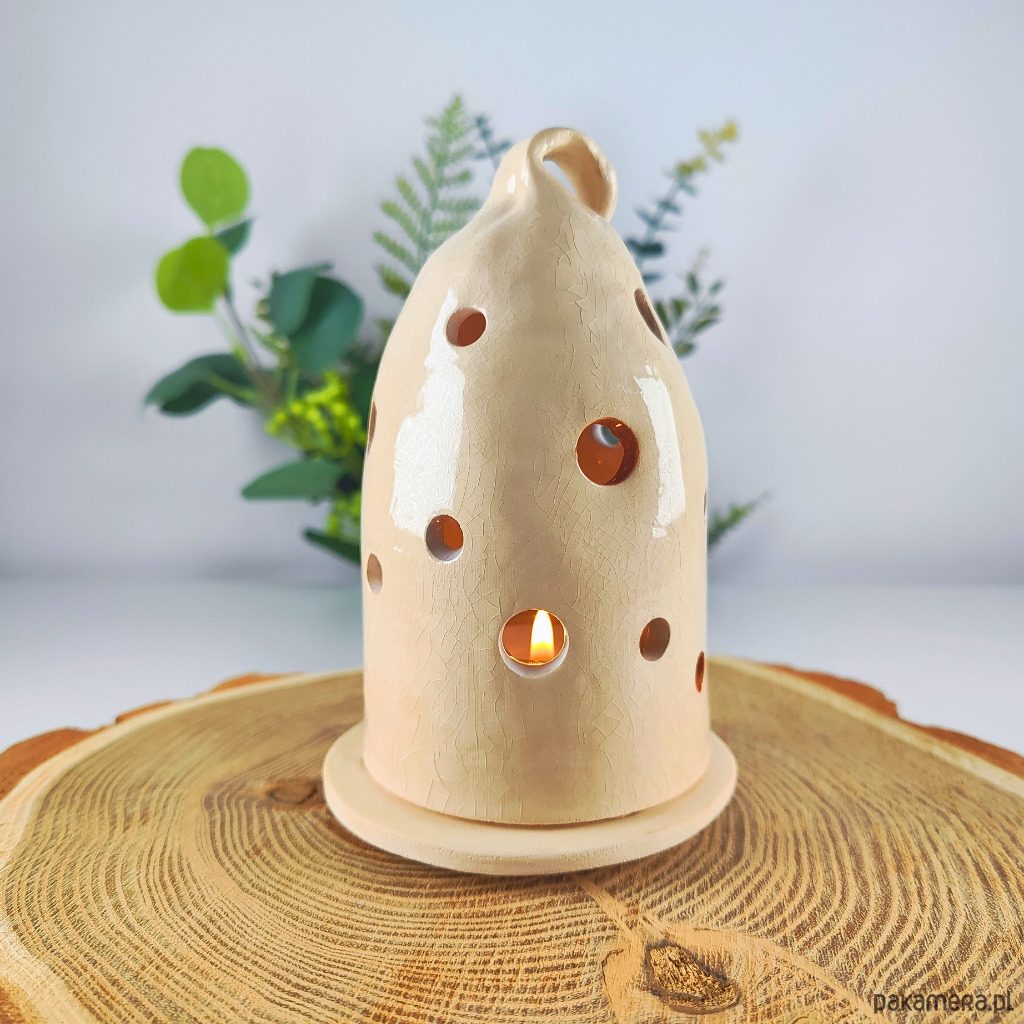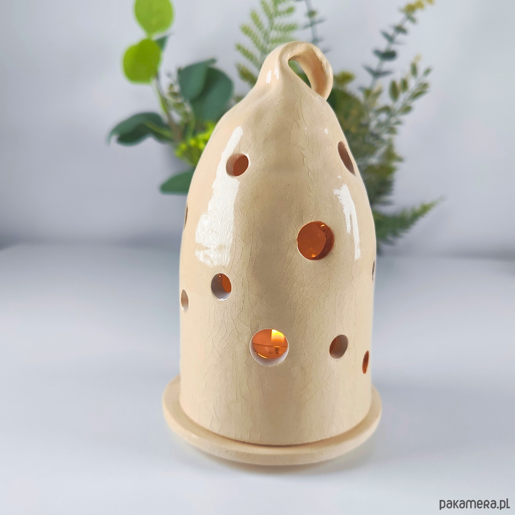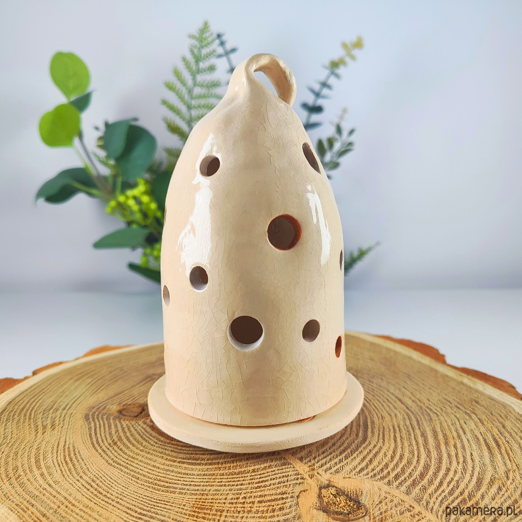 Ręcznie lepiony, ceramiczny lampion z jasnej gliny. Kropki na podstawce w kolorach: biały, niebiesko-szary, rudy.