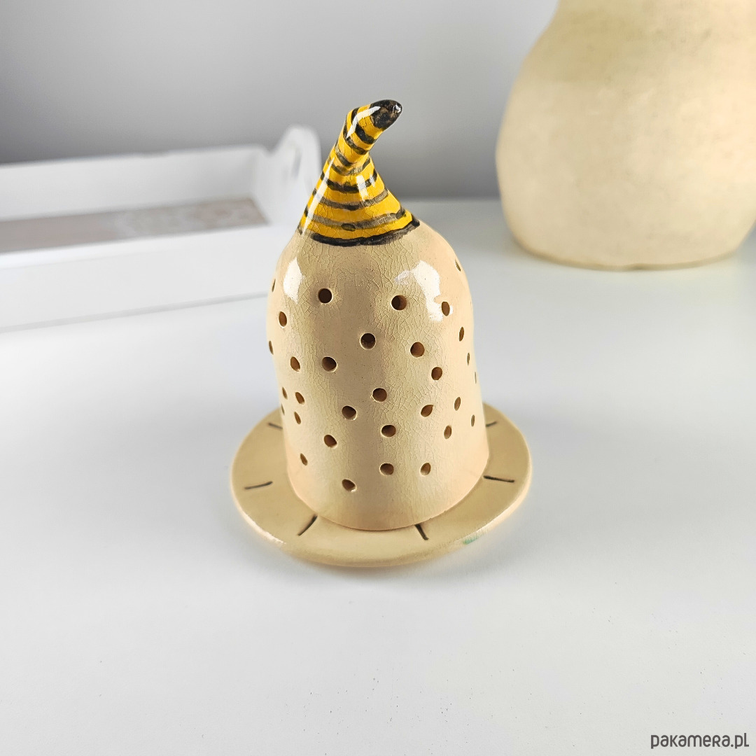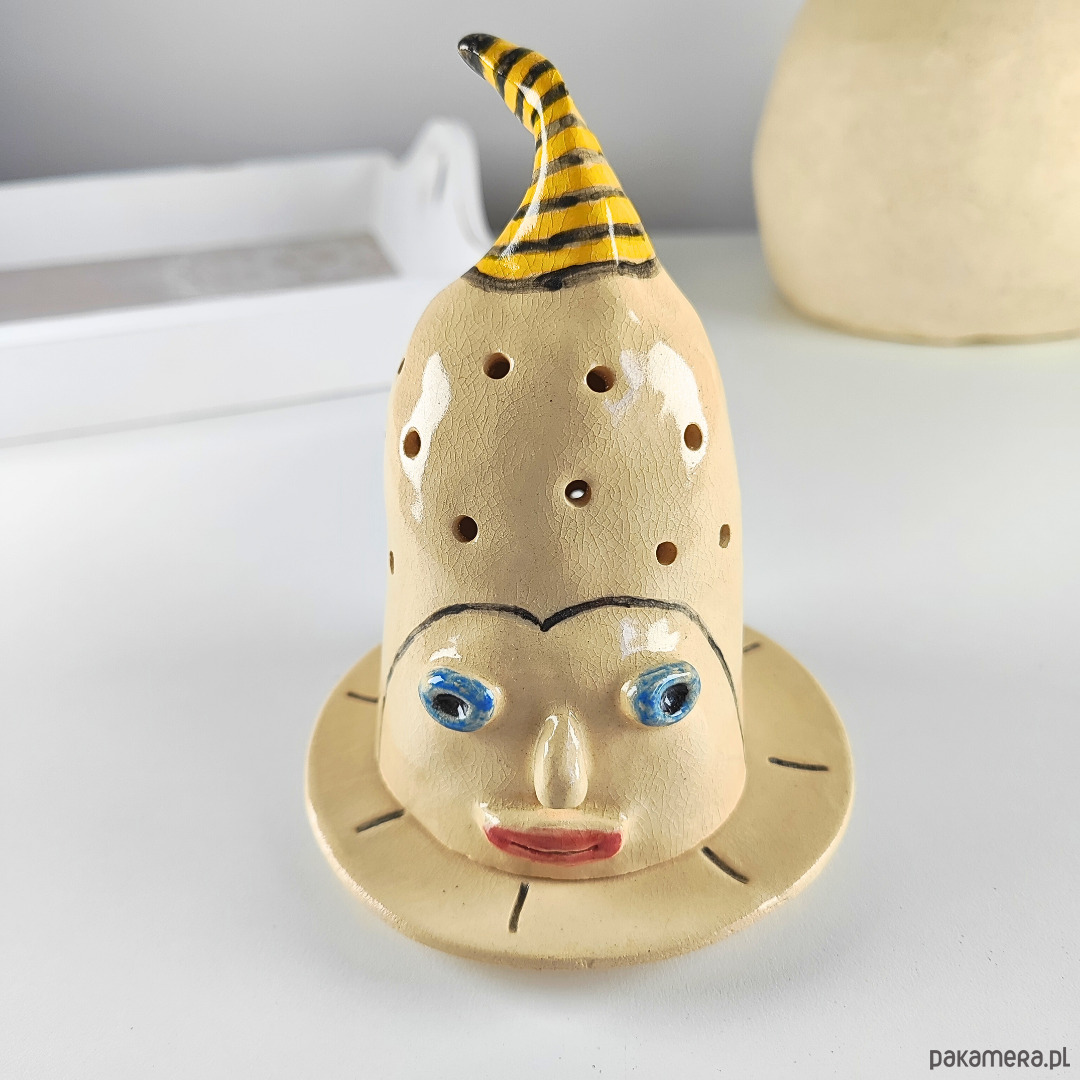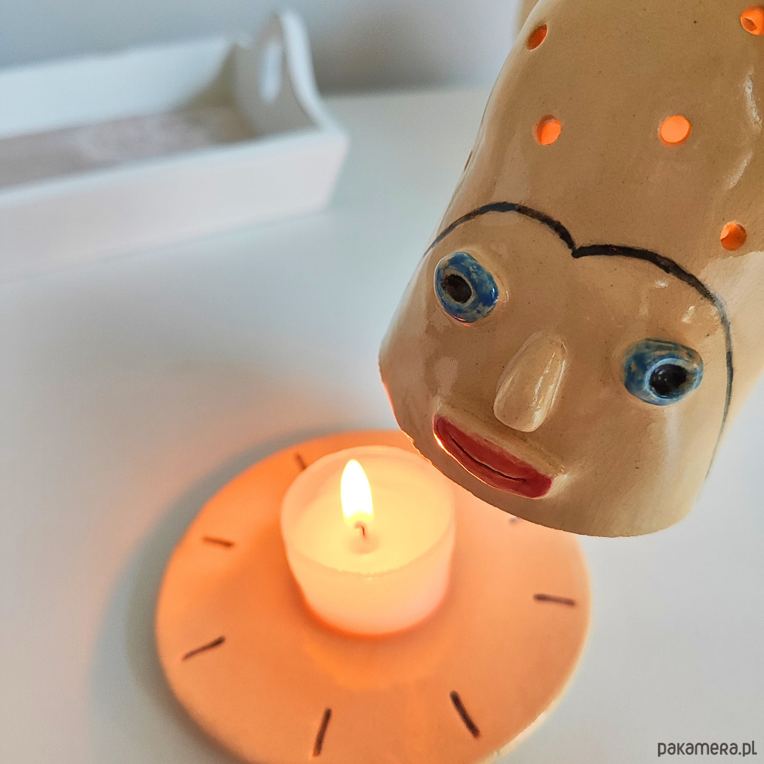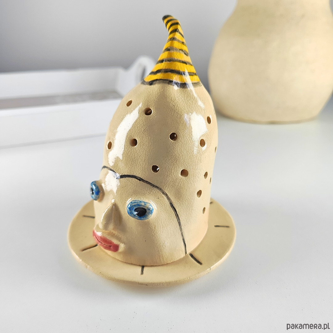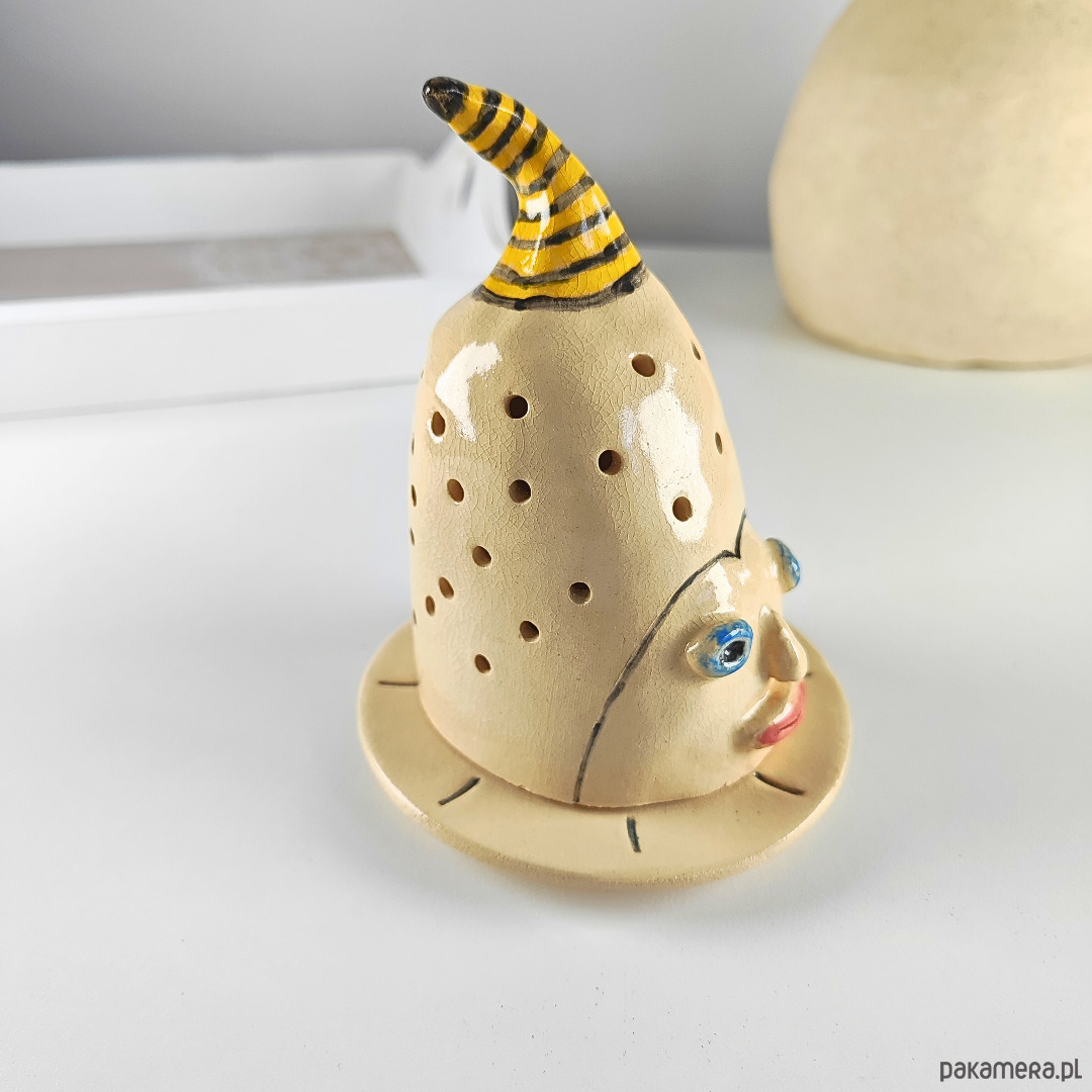 Ręcznie lepiony, ceramiczny lampion z jasnej gliny.