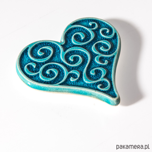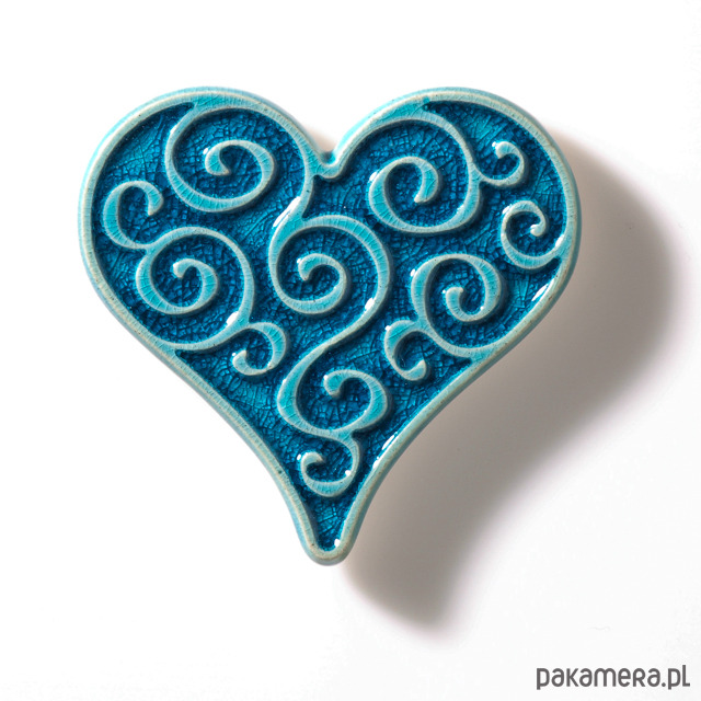 Ceramiczne, ornamentowe serce z naklejonym od spodu okrągłym, bardzo silnym magnesem. Wykonane z jasnej gliny, pokryte błyszczącym szkliwem. Polecam serdecznie.