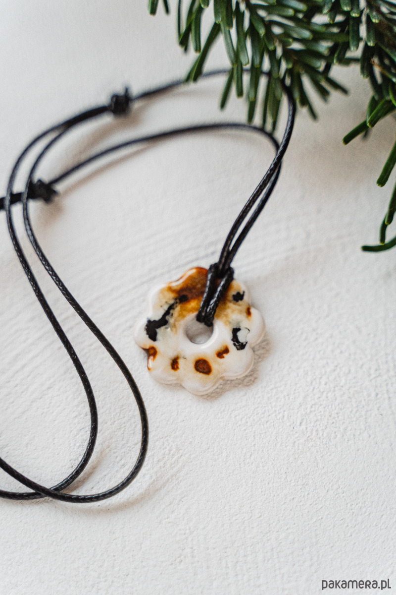 Ten naszyjnik został wykonany z najwyższej jakości gliny i jest pokryty błyszczącym szkliwem. Wisior nawleczony jest na wegański, czarny rzemień o regulowanej długości.