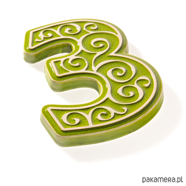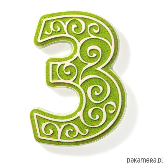 Ceramiczna cyfra 3 z ozdobnym ornamentem, do zamocowania na elewacji budynku. Wykonana z jasnej gliny, pokryta błyszczącym szkliwem, wypalana dwukrotnie w wysokiej temperaturze. Do klejenia cyfr można stosować kleje montażowe odporne na działanie warunków atmosferycznych. Unieruchomienie cyfry na czas schnięcia kleju umożliwia krawędziowy kołnierz od spodu cyfry, ułatwiający jej zawieszenie na kołku zamocowanym w ścianie tak aby kołek nie był widoczny. Polecam serdecznie.