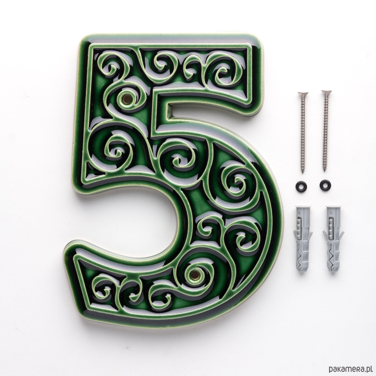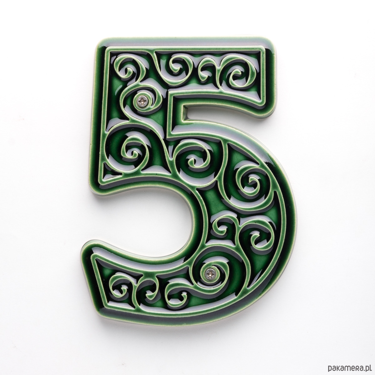 Ceramiczny numer domu, cyfra 5, zieleń butelkowa, do przykręcenia