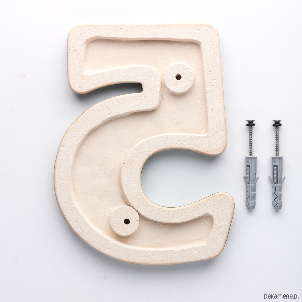 Ceramiczna cyfra z lekko wypukłym, dekoracyjnym ornamentem. Ręcznie wykonana z jasnej gliny, pokryta błyszczącym szkliwem. Dwukrotnie wypalana w wysokiej temperaturze.