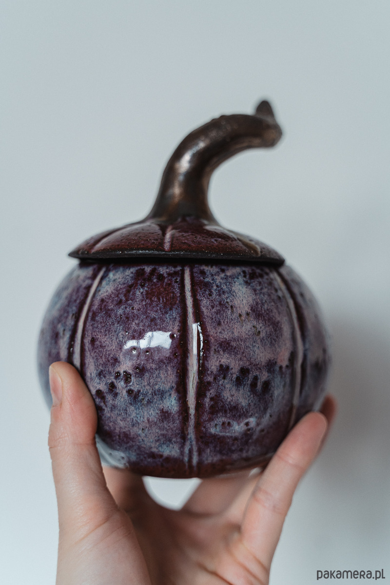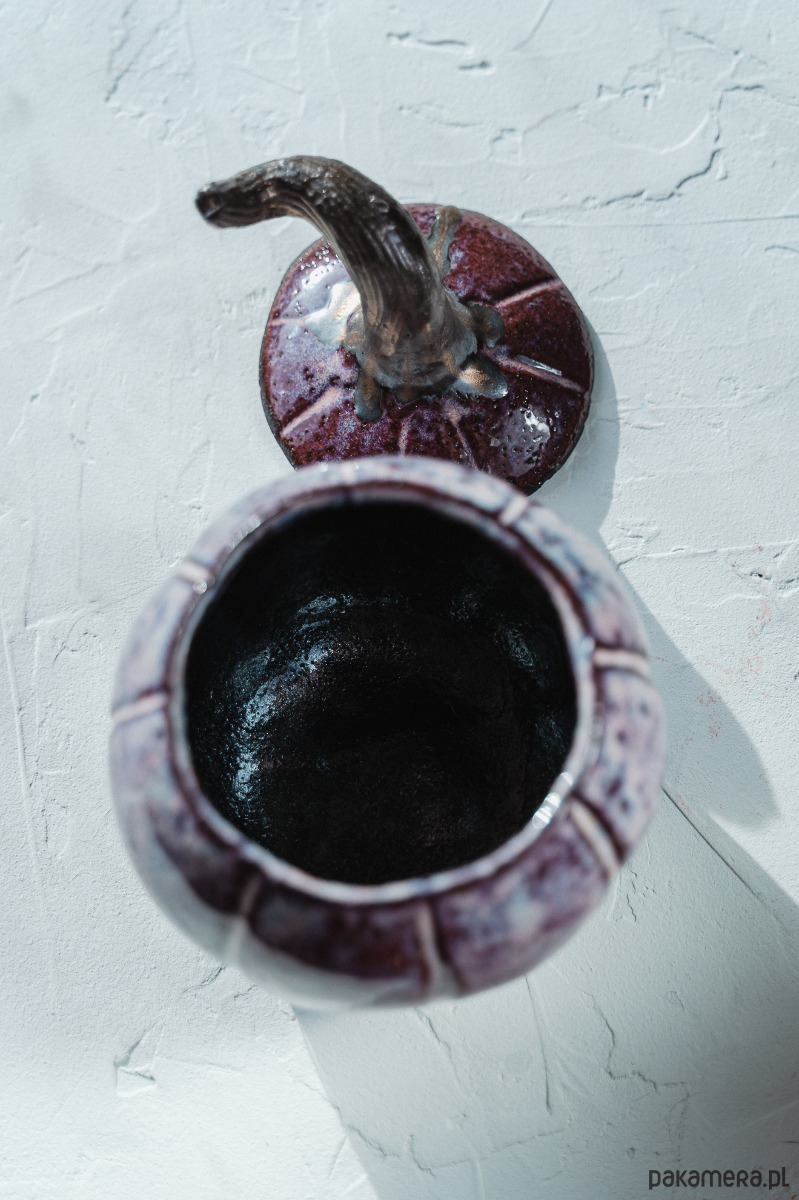 Ceramiczna figurka - pojemnik dynia wykonany ręcznie z ciemnej gliny.