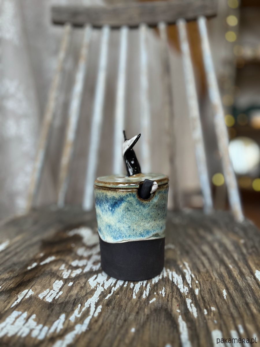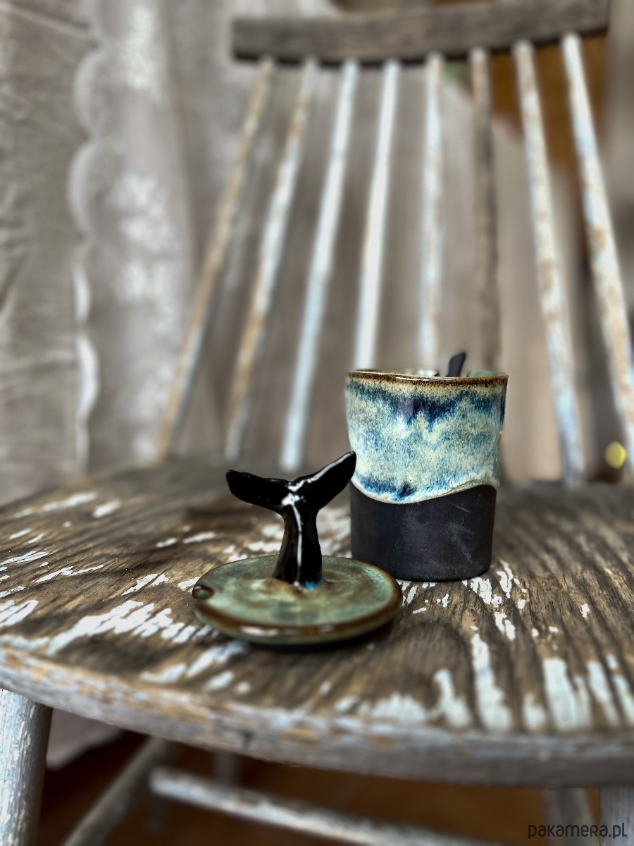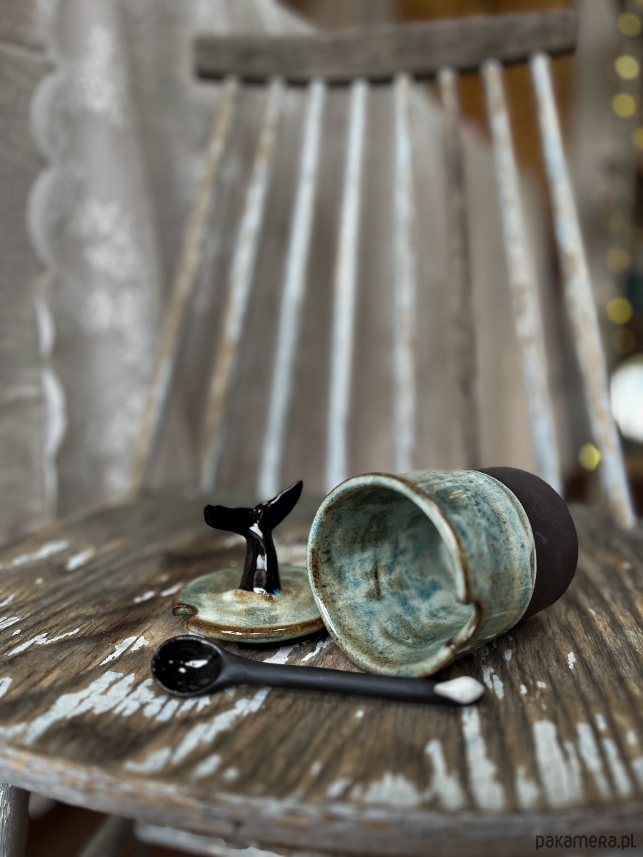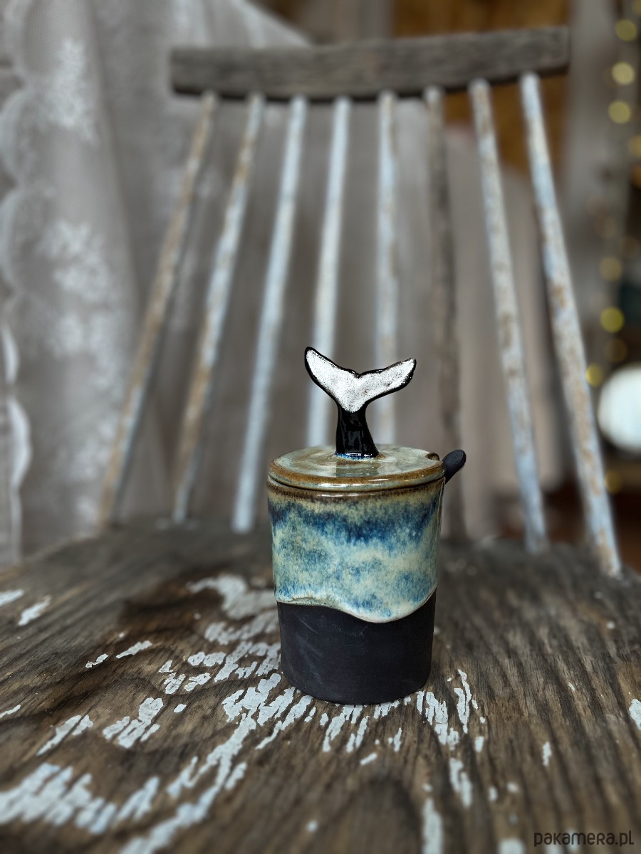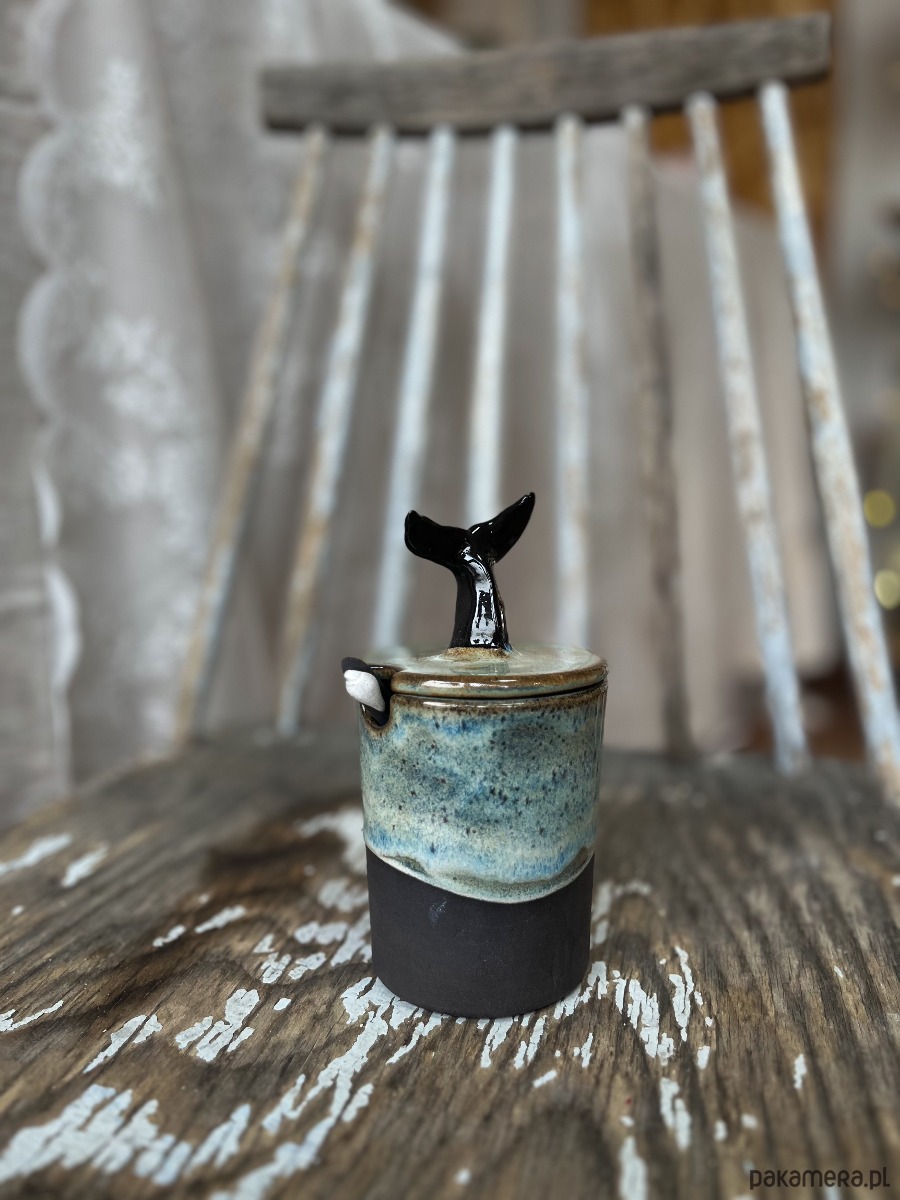 Ręcznie lepiony i szkliwiony pojemnik z oryginalną przykrywką, gdzie uchwytem jest czarny ogon wieloryba/orki.