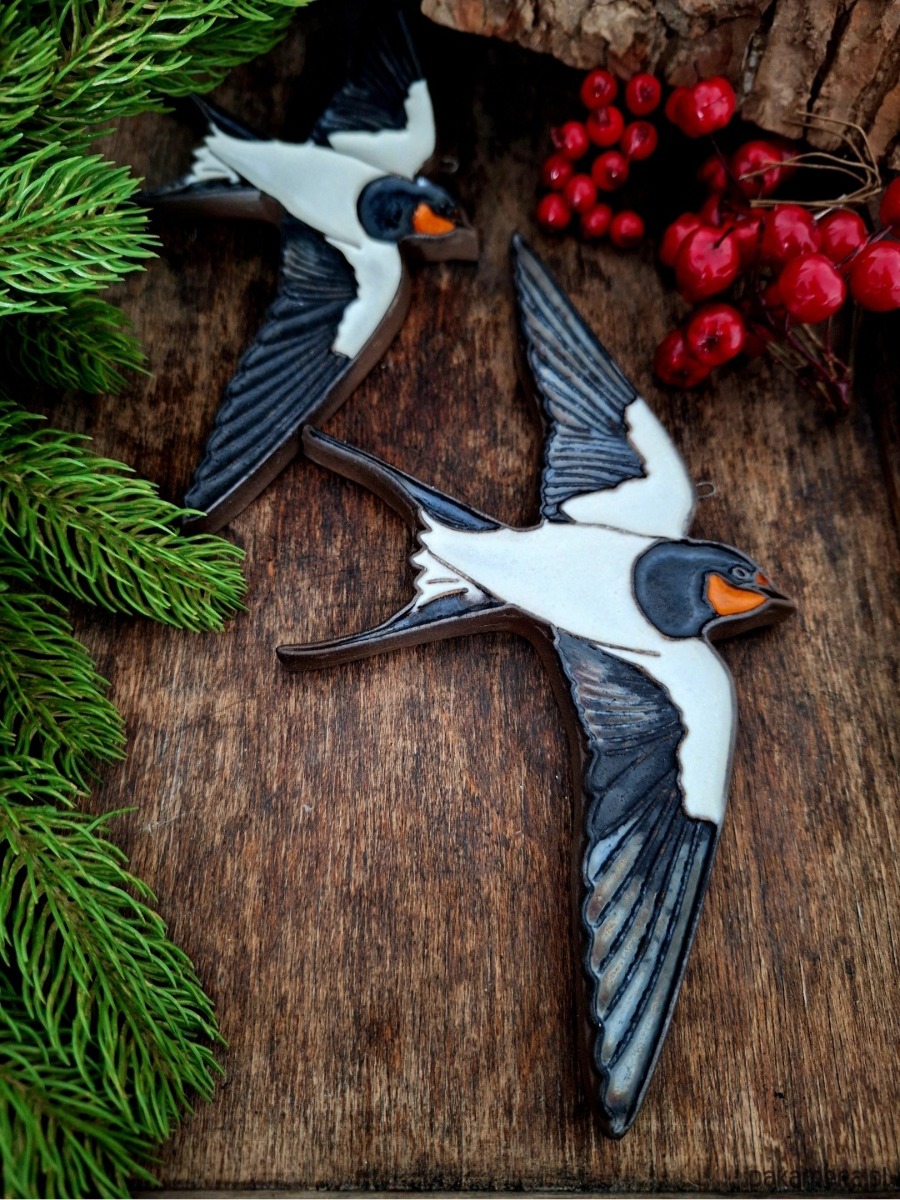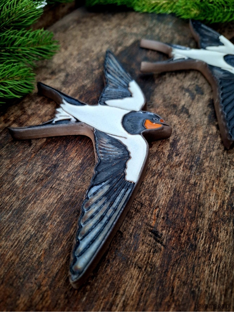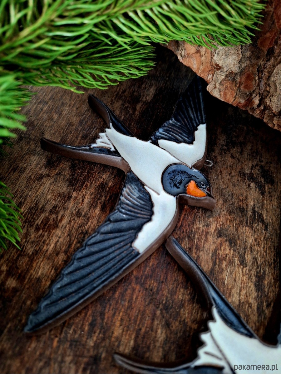 Ceramiczne dekoracje w kształcie ptaków jaskółek - 2 sztuki. Dekor ręcznie formowany i szkliwiony w kolorach czerni i bieli. Każdy ma metalowy haczyk umożliwiający zawieszenie.