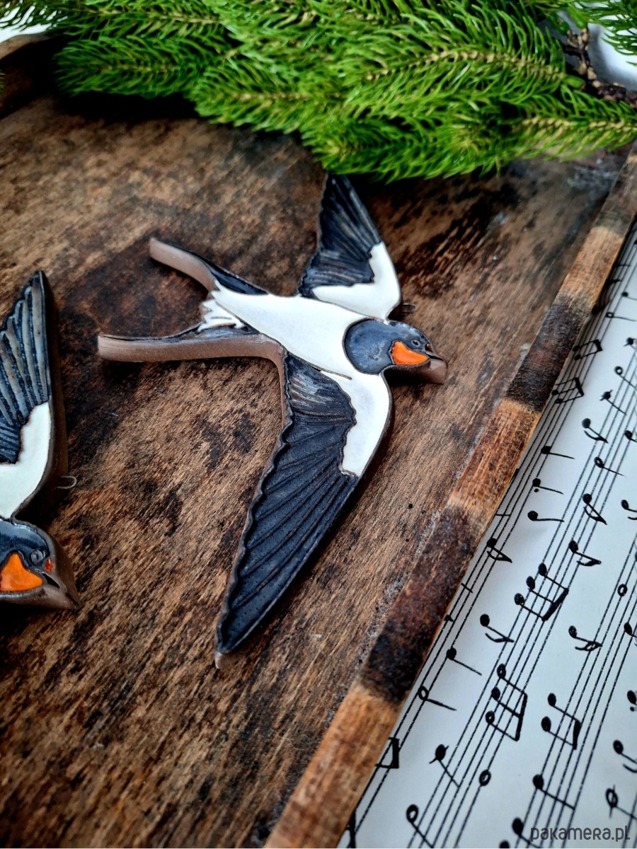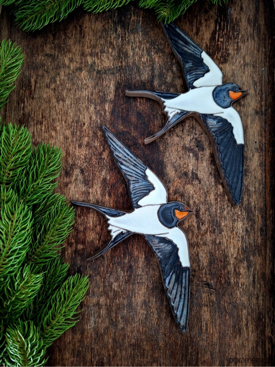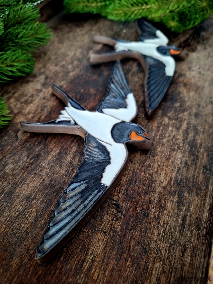 Ceramiczne dekoracje w kształcie ptaków jaskółek - 2 sztuki. Dekor ręcznie formowany i szkliwiony w kolorach czerni i bieli. Każdy ma metalowy haczyk umożliwiający zawieszenie.