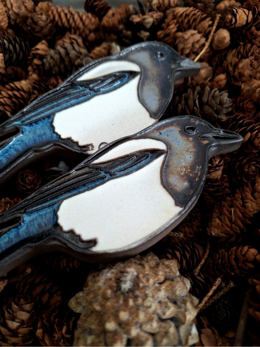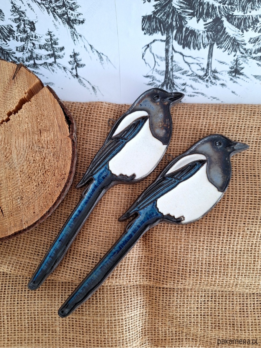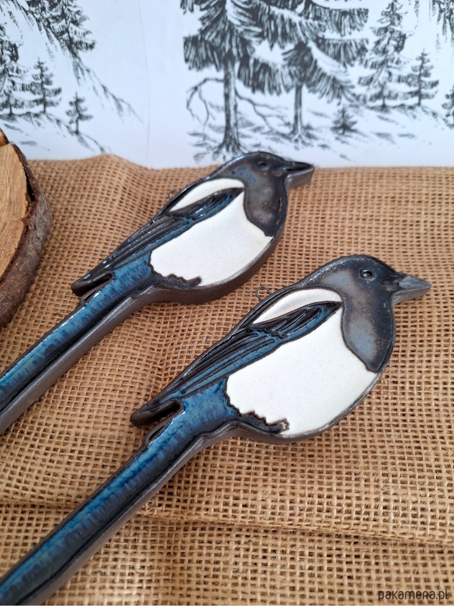 Ceramiczne dekoracje w kształcie ptaków sroki - 2 sztuki. Dekor ręcznie formowany i szkliwiony w kolorach bieli, niebieskiego i szarości. Każdy ma metalowy haczyk umożliwiający zawieszenie na ścianie czy drzewie.