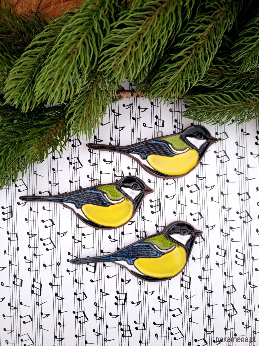 Ceramiczne dekoracje w kształcie ptaków - 3 sztuki. Dekor ręcznie formowany i szkliwiony w kolorach żółci, zieleni, czerni i niebieskiego. Każdy ma metalowy haczyk umożliwiający zawieszenie na scianie czy drzewie. Ozdoba idealna do ogrodu, altany czy leśnego zagajnika. Sprawdzi się również jako dekoracja na choinkę czy okna.