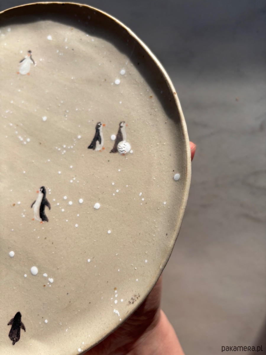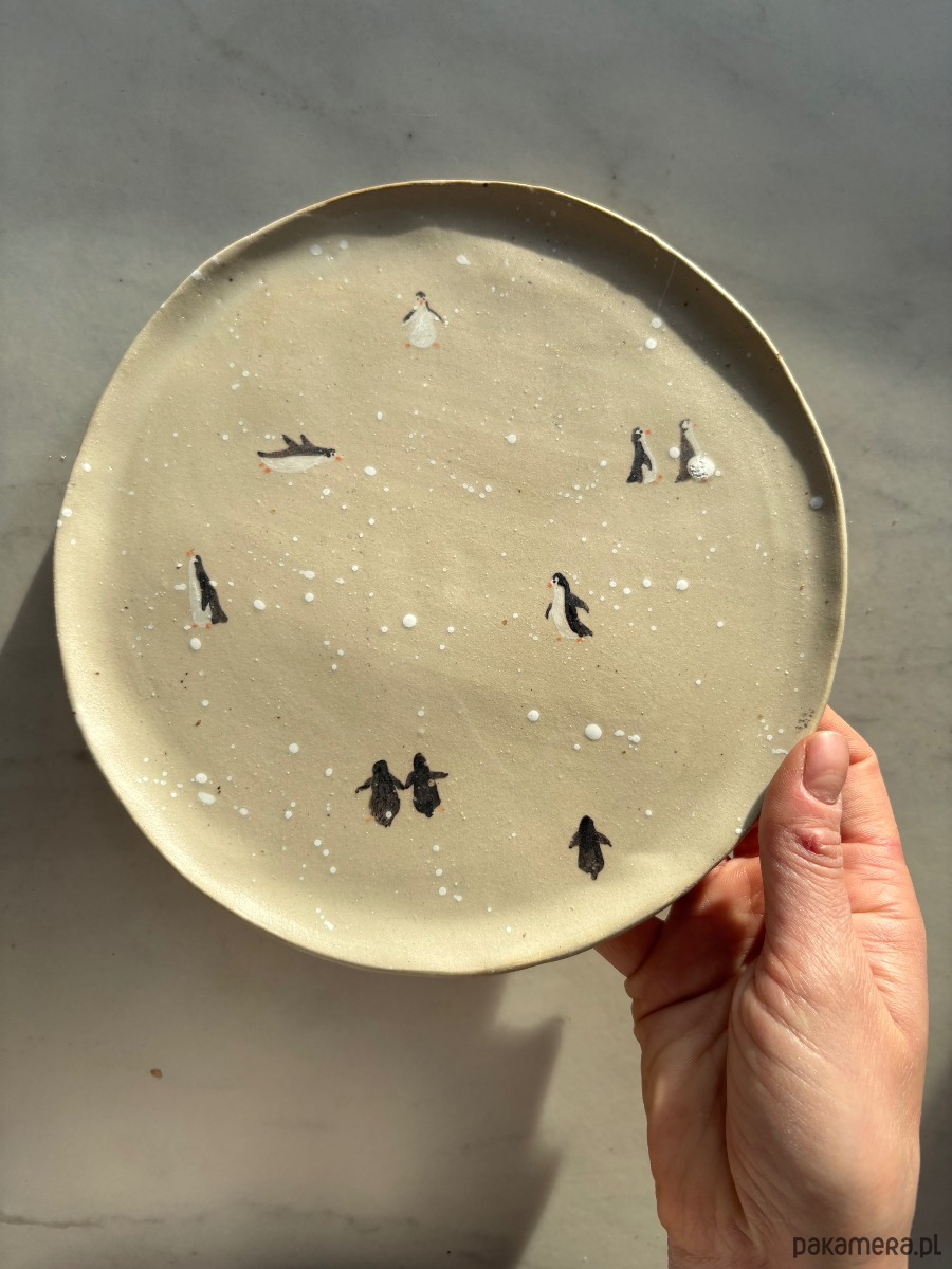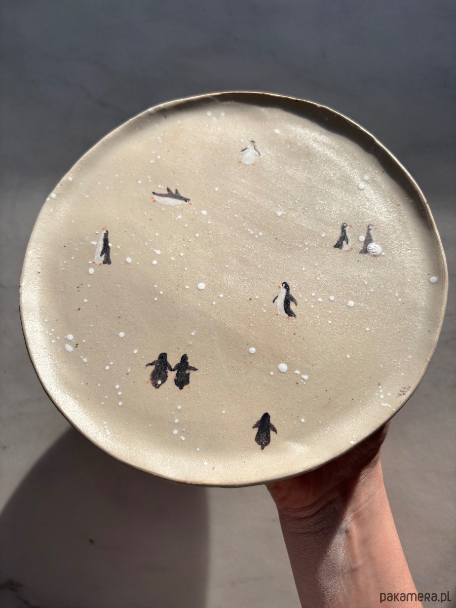 Ceramiczny unikatowy ręcznie formowany talerz z ręcznie malowanymi pingwinami, pokryty matowym transparentnym szkliwem. Organiczny, inspirowany naturą kształt naczynia wprowadza do przestrzeni harmonię, a jednocześnie jest wyjątkowym elementem czyniącym wnętrze nowoczesnym i designerskim.