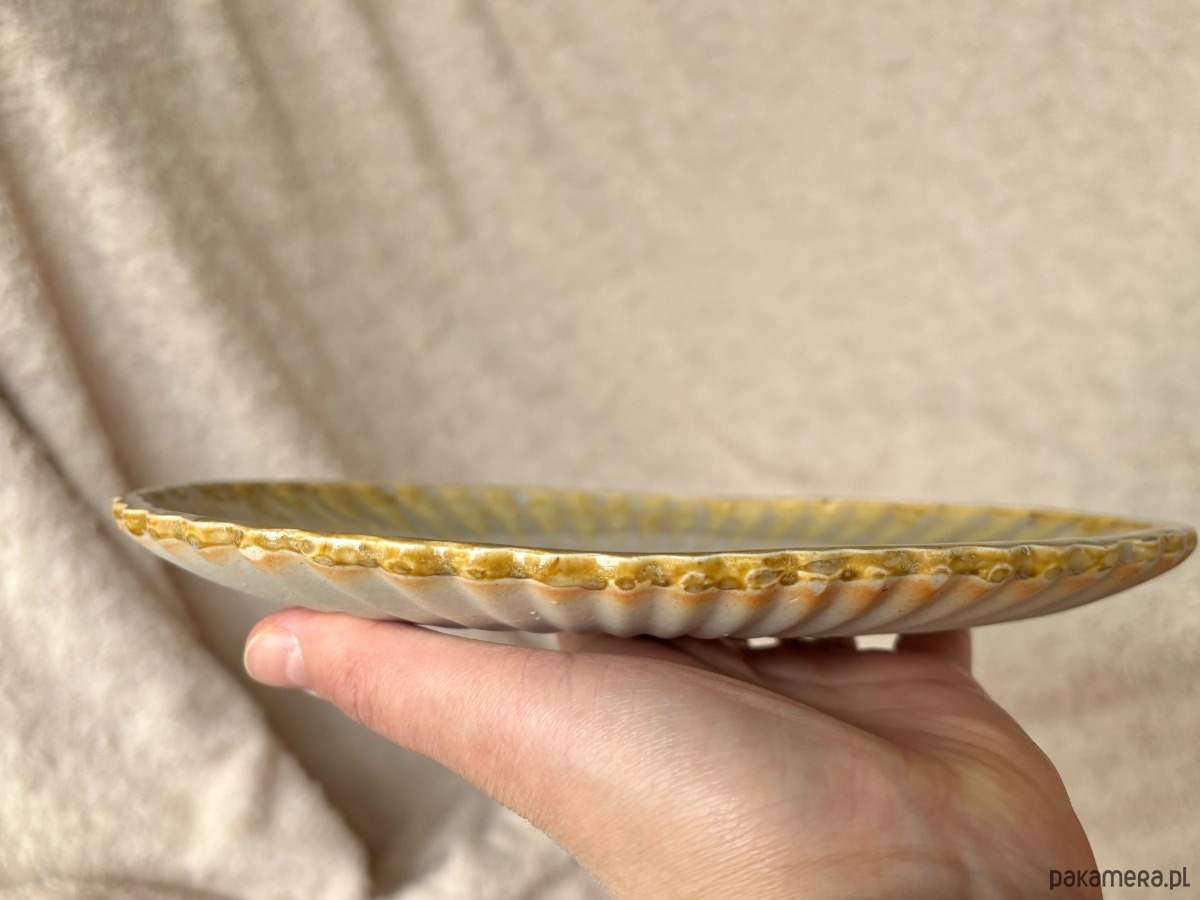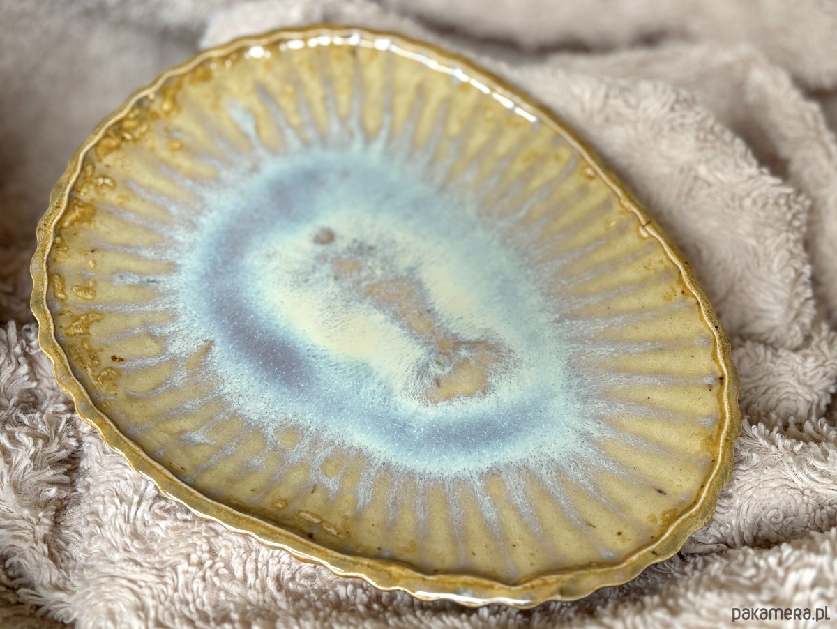 Ceramiczny talerz "Perła" to przykład ceramiki, która przyciąga spojrzenia. Boki talerza nawiązujące do kształtu muszli i szkliwo tworzące wzór na miarę masy perłowej wpisują się w marynistyczny klimat i przypominają o beztrosce patrzenia na morskie fale.