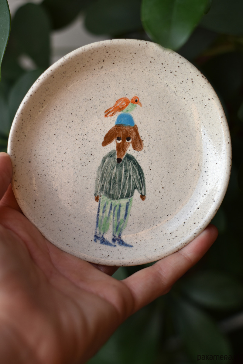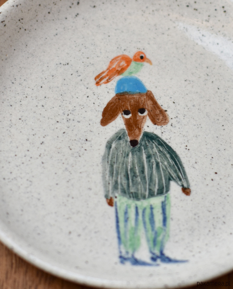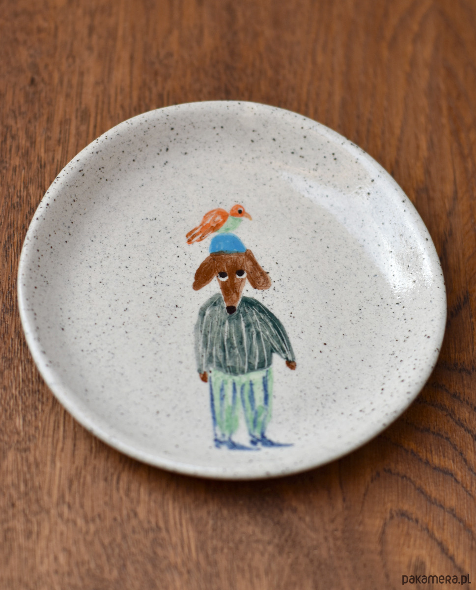 Talerzyk z przygodami Jamnika Myszora to ręcznie malowany artefakt od Richie Acapulco, który można powiesić na ścianie, jak zarówno korzystać z niego w kuchni. Ilustracja Jamnika z papugą na głowie to część większej kolekcji czarek i talerzy. Każdy rysunek jest unikatowy i wyjątkowy.