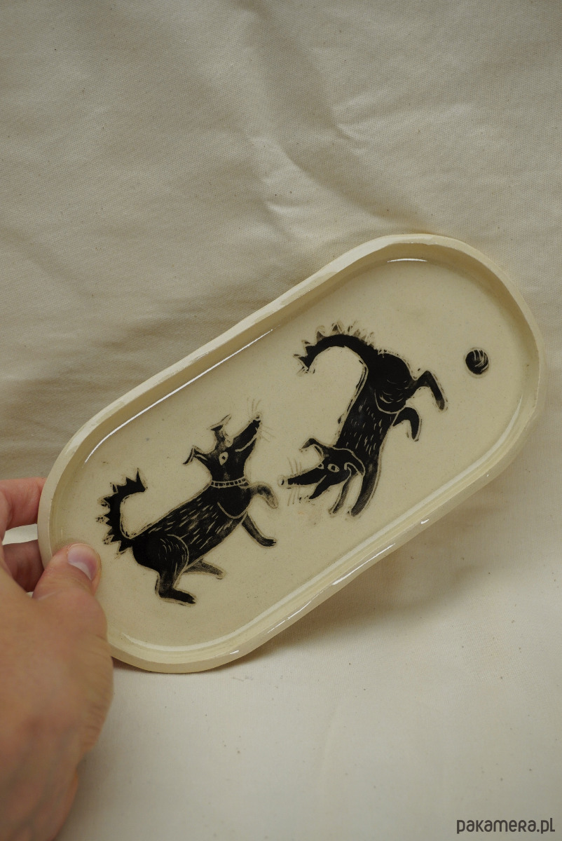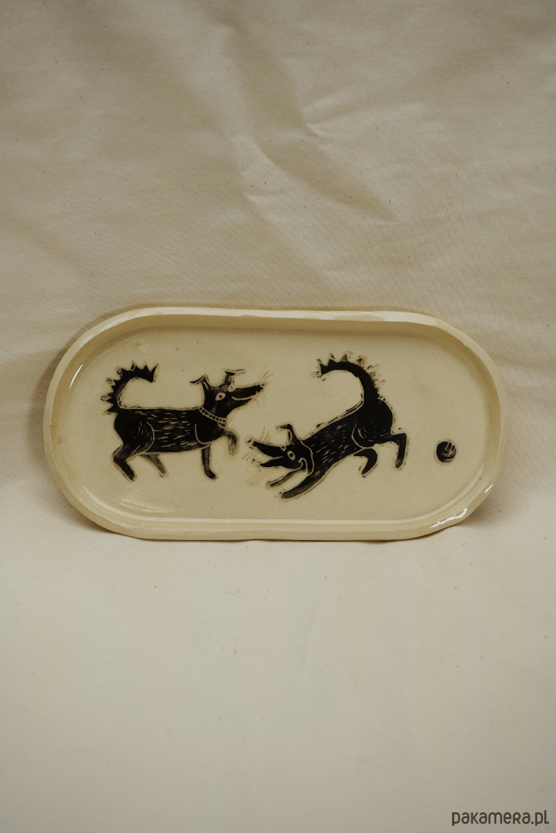 Ceramiczny talerzyk w zabawne pieski. Wykonany ręcznie, szkliwiony i malowany angobami, zdobiony metodą sgraffito. Może służyć jako patera na słodycze, podstawka na biżuterię, klucze, ozdobny talerz na ścianę. Dla miłośników rękodzieł, piesków i nie tylko! Każdy talerzyk różni się od siebie. Do wyboru z wzorem dwóch piesków, albo trzech.