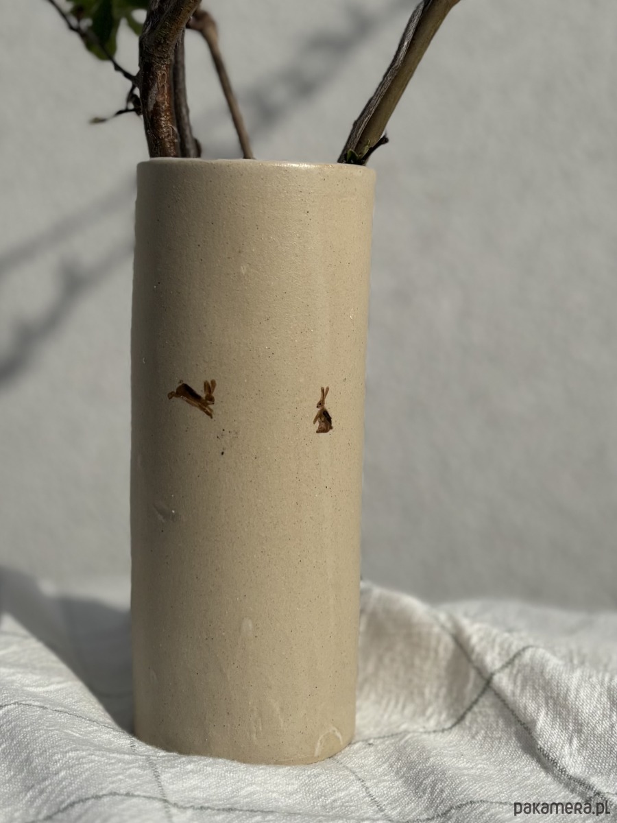 Ręcznie formowany ceramiczny wazon w skandynawskim stylu z ręcznie malowanymi zającami o unikatowym szkliwieniu inspirowanym wiosną, idealny jako dekoracja na nadchodzące święta Wielkanocne.
