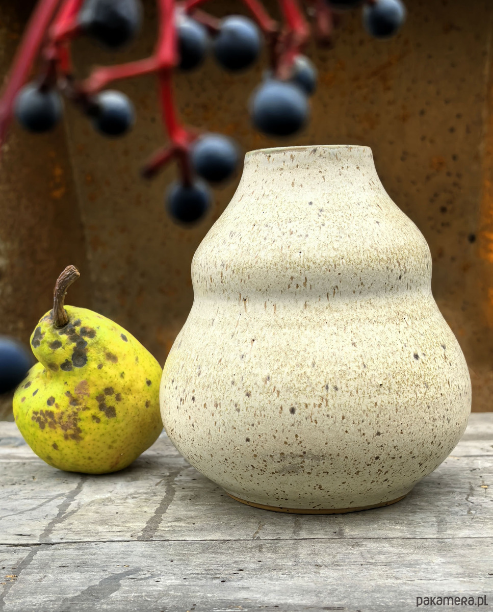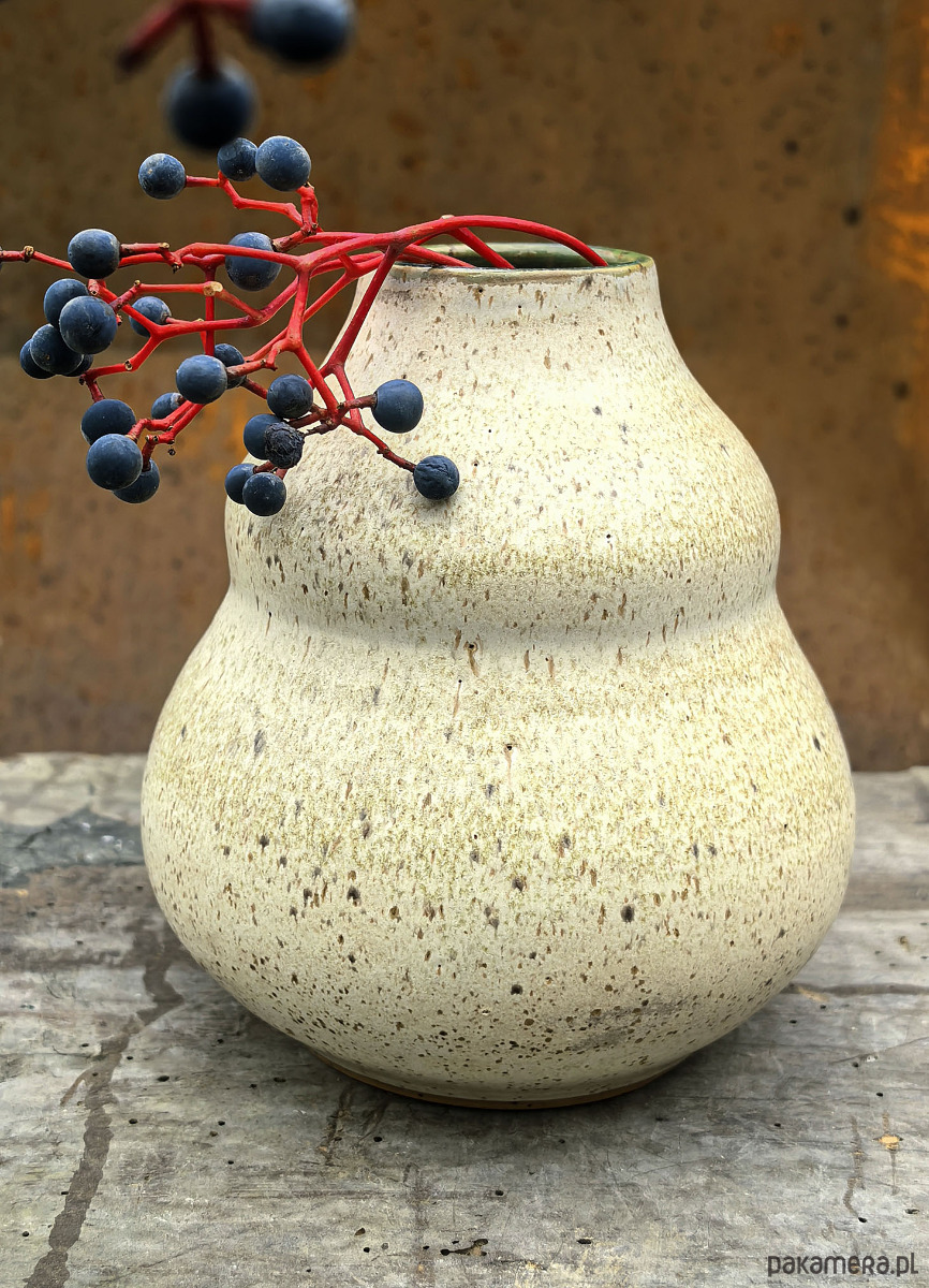 Wazon ceramiczny wykonany na kole garncarskim. Poszkliwiony beżowym, nakrapianym szkliwem o satynowym wykończeniu. Wnętrze w zieleni, błyszczące. Podwójny wypał w wysokiej temperaturze zapewnia mocny spiek i tym samym wodoszczelność wyrobu. Wysokość 14,5cm, średnica otworu 4,5cm.