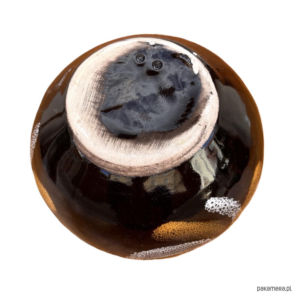 Modernistyczny fason współgra z opalizującym wybarwieniem: polewa ma niejednorodny brązowy kolor, co miejscami przypomina przebarwienia benzynowe. Rant zaznaczono nieco ciemniejszym, nieregularnym pasem.
