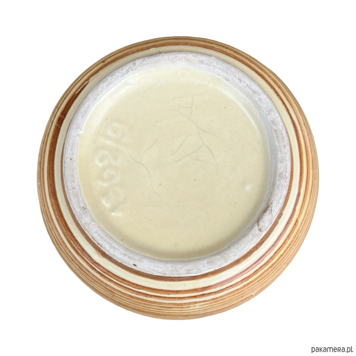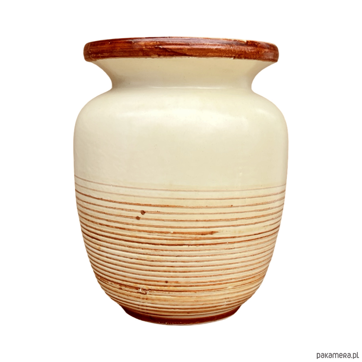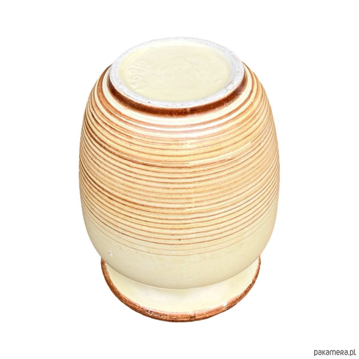 Ceramiczny wazon w stylu modernistycznym z sygnaturą 1362/9 został wykonany w Niemczech dla VEB Keramik Werke Haldensleben w latach 50. Wazon w odcieniach brązu z ciekawą malatura w pasy. Zachowany jest w bardzo dobrym stanie, z minimalnymi śladami użytkowania, od spodu widoczne oznaczenie modelu.