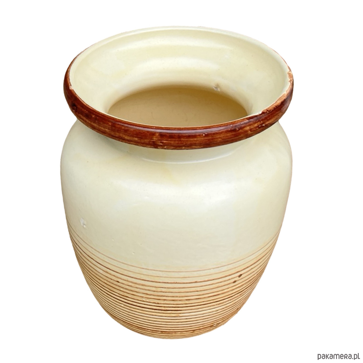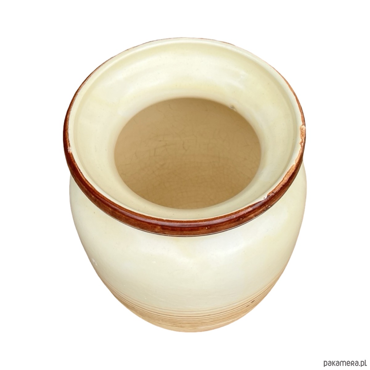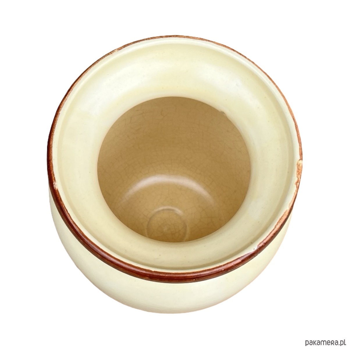 Ceramiczny wazon w stylu modernistycznym z sygnaturą 1362/9 został wykonany w Niemczech dla VEB Keramik Werke Haldensleben w latach 50. Wazon w odcieniach brązu z ciekawą malatura w pasy. Zachowany jest w bardzo dobrym stanie, z minimalnymi śladami użytkowania, od spodu widoczne oznaczenie modelu.