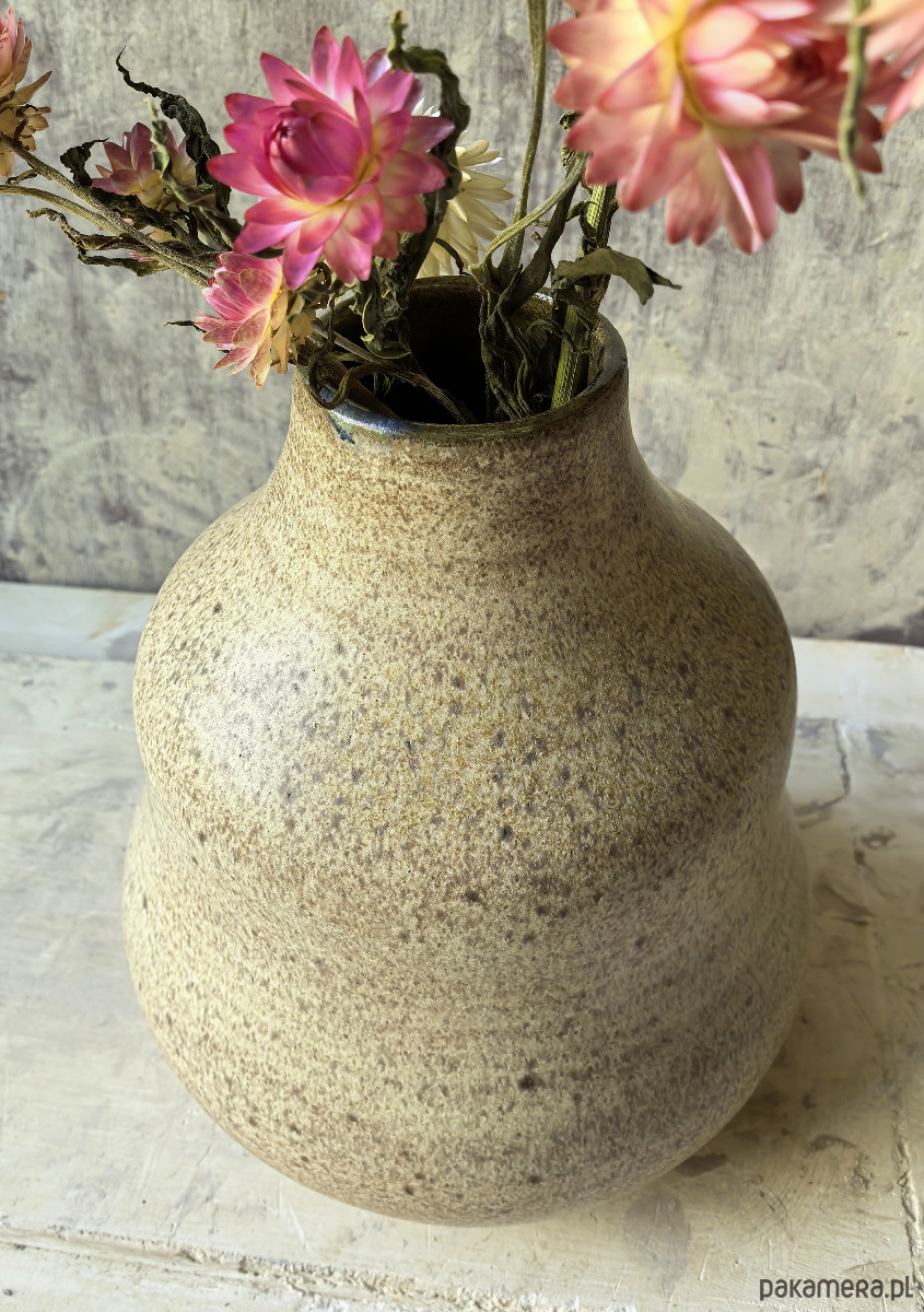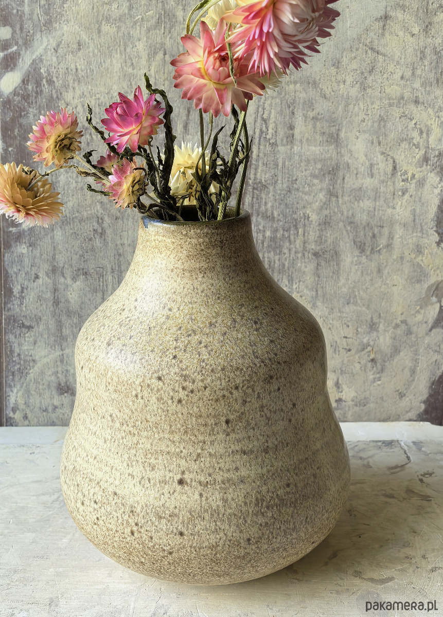 Wazon ceramiczny wykonany na kole garncarskim. Poszkliwiony beżowym, nakrapianym szkliwem o satynowym wykończeniu. Wnętrze w zieleni, błyszczące. Podwójny wypał w wysokiej temperaturze zapewnia mocny spiek i tym samym wodoszczelność wyrobu. Wysokość 15cm, średnica otworu 4,5cm.
