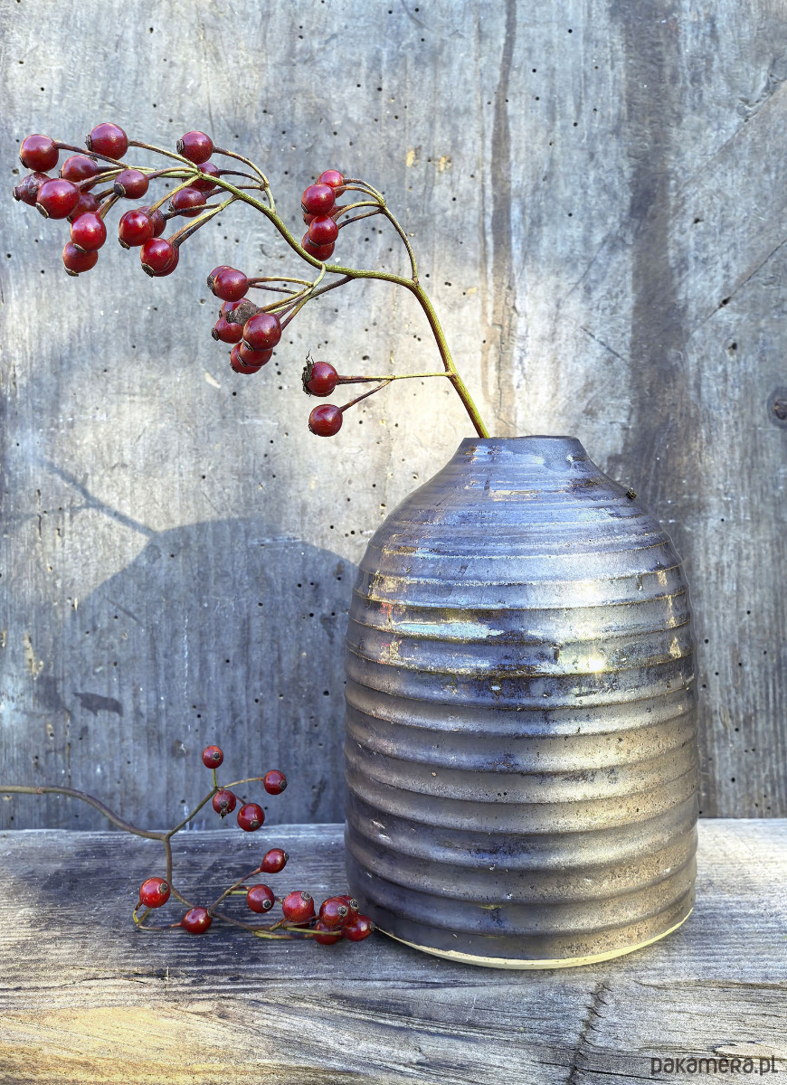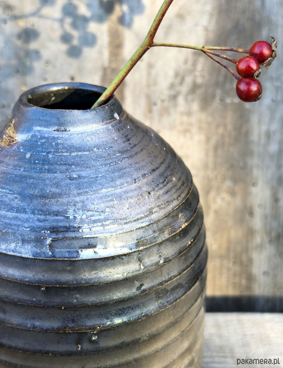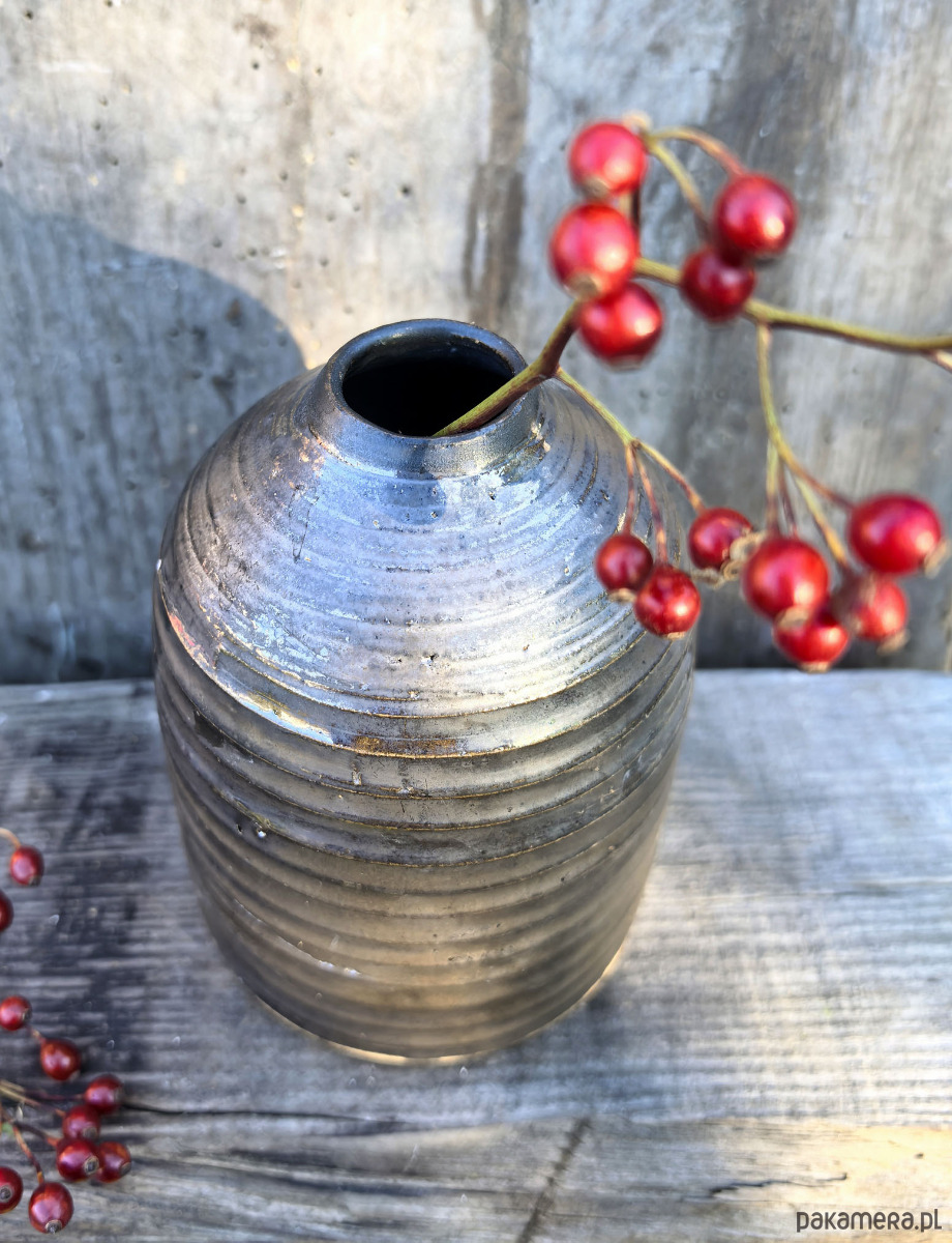 Niepowtarzalny wazonik wykonany na kole garncarskim. Poszkliwiony w kolorze ciemnej czekolady, szkliwem z efeketm metalicznego połysku. Podwójny wypał w wysokiej temperaturze zapewnia mocny spiek i tym samym wodoszczelność wyrobu. Wysokość 12cm, średnica otworu 2,5cm.