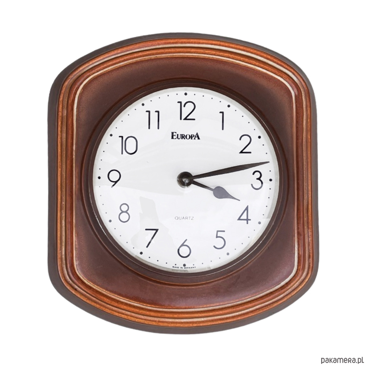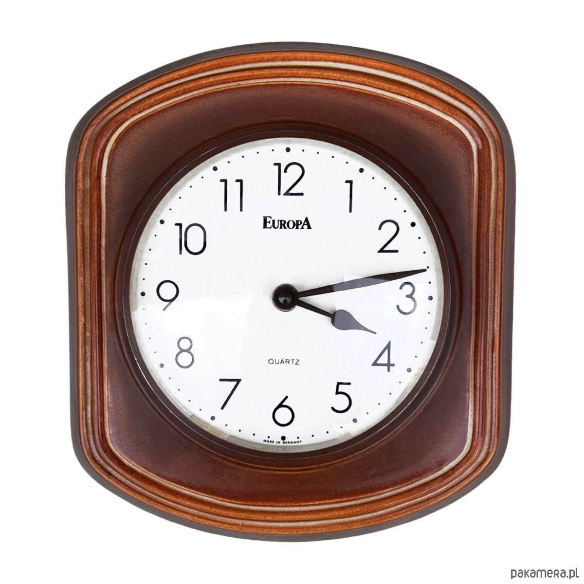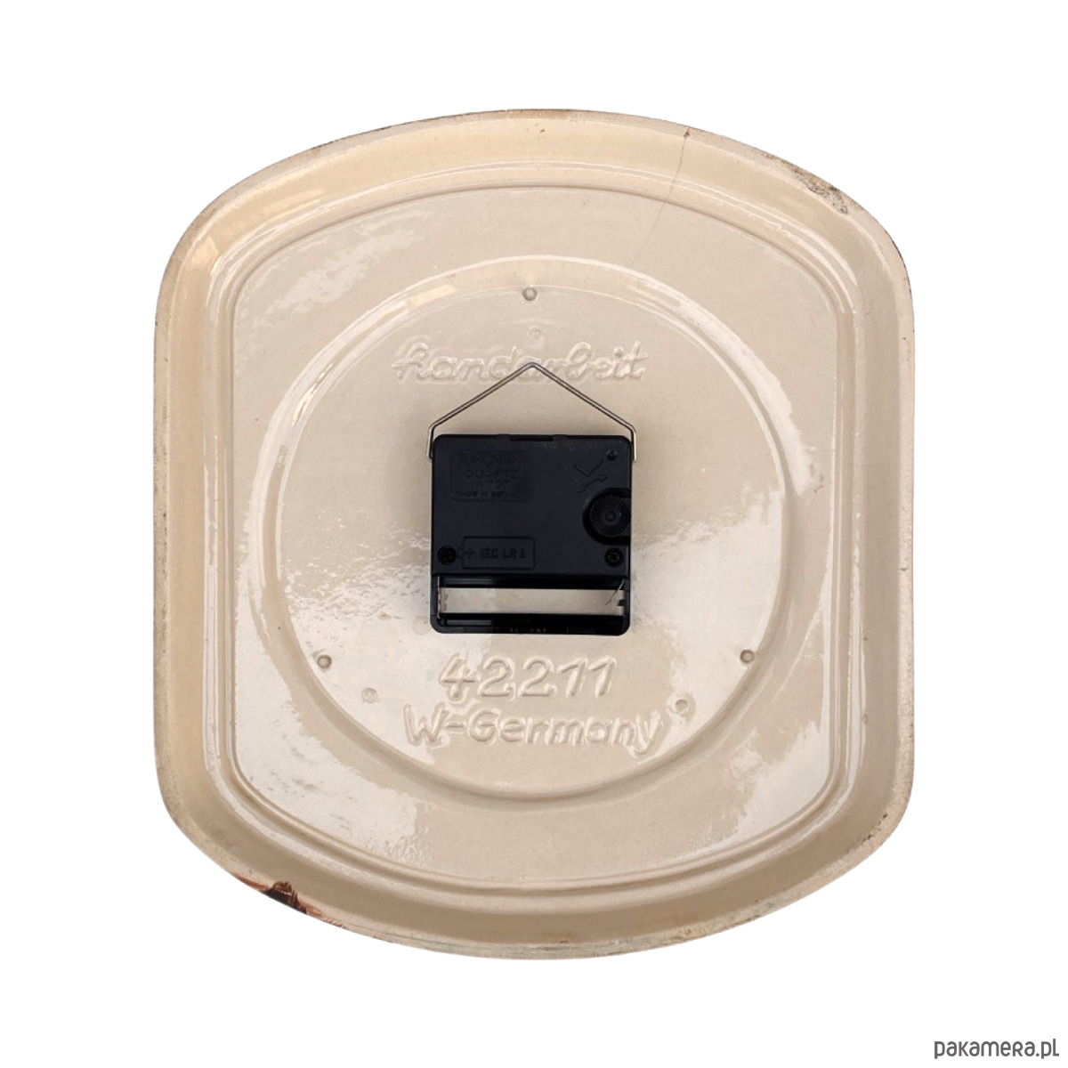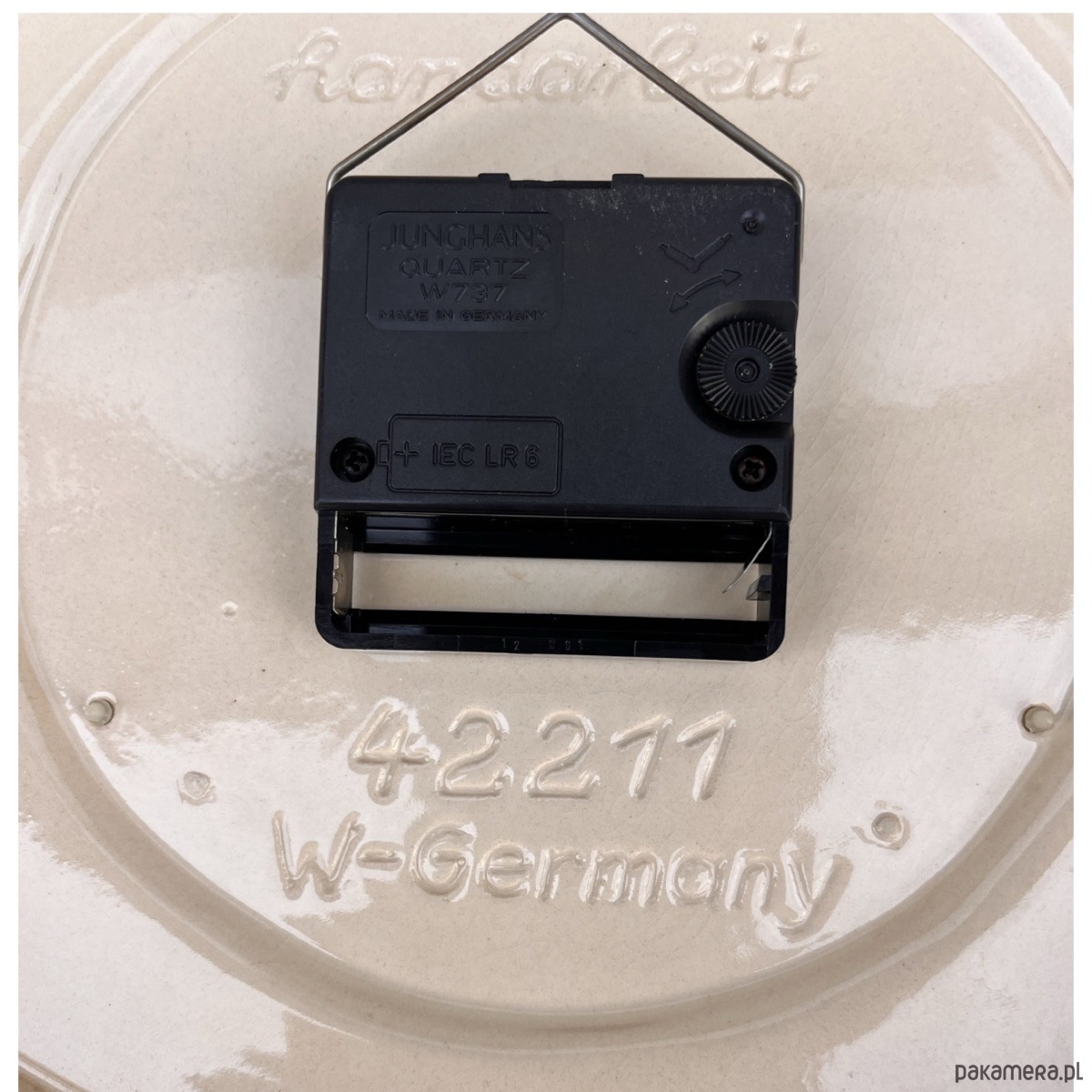 Kuchenny zegar ścienny Europa (Junghans) wyprodukowany w Niemczech w latach 70. Zegar w stylu mid-century modern z tarczą ceramiczną o ciekawym kształcie z frezowaniami. Ceramika satynowa w fajnym koloracg ziemi. Tarcza nakryta sferycznym szkłem w chromowanym okuciu. Stan zachowania jest oryginalny, bardzo dobry. Zegar sprawny na pojedynczą baterię AA. Dużym atutem zegara jest mechanizm wyprodukowany przez firmę Junghans. Bardzo ciekawy element dekoracji np. do kuchni.