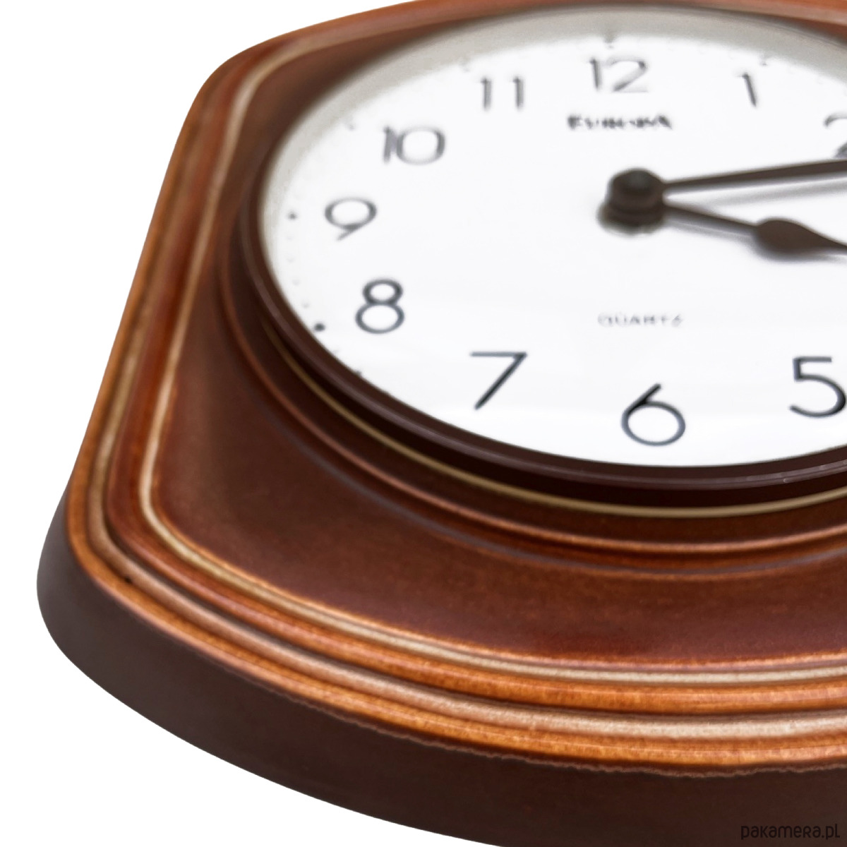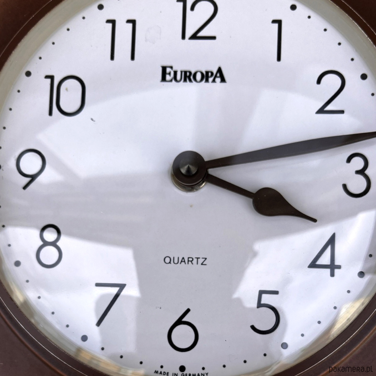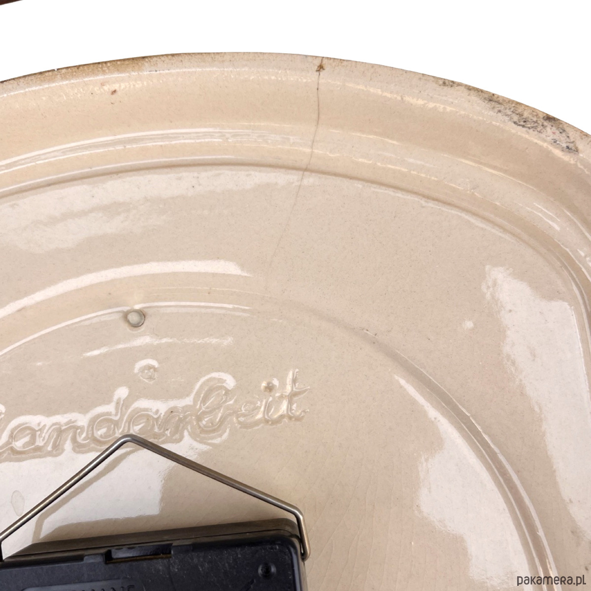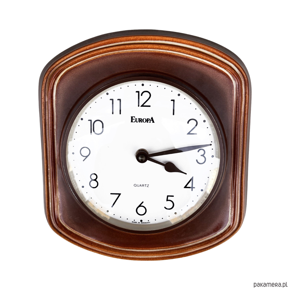 Kuchenny zegar ścienny Europa (Junghans) wyprodukowany w Niemczech w latach 70. Zegar w stylu mid-century modern z tarczą ceramiczną o ciekawym kształcie z frezowaniami. Ceramika satynowa w fajnym koloracg ziemi. Tarcza nakryta sferycznym szkłem w chromowanym okuciu. Stan zachowania jest oryginalny, bardzo dobry. Zegar sprawny na pojedynczą baterię AA. Dużym atutem zegara jest mechanizm wyprodukowany przez firmę Junghans. Bardzo ciekawy element dekoracji np. do kuchni.