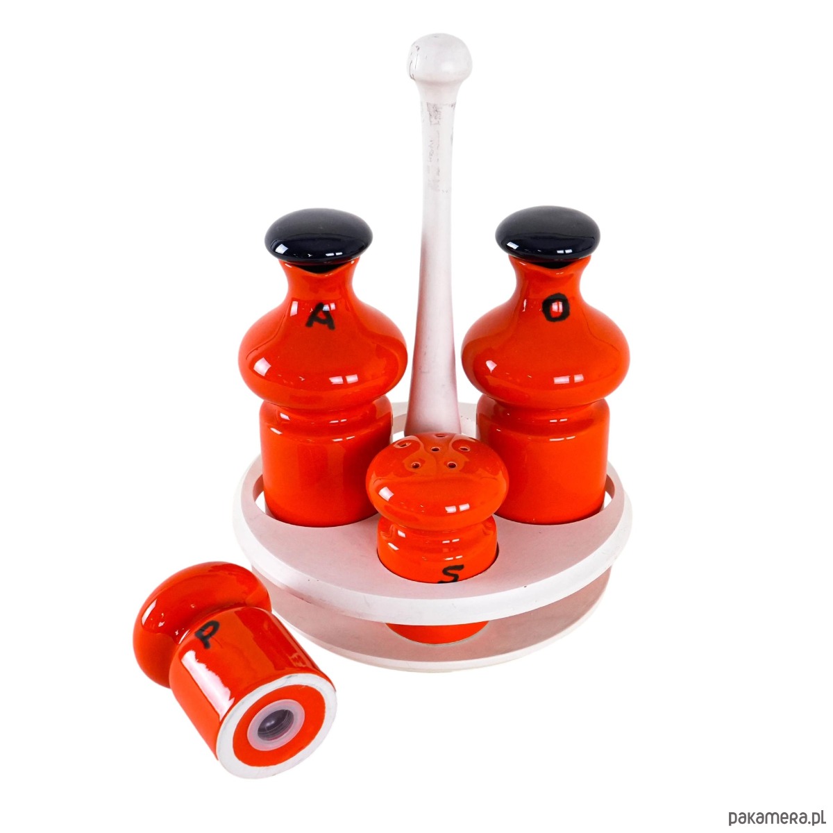 Unikalny, vintage zestaw do przypraw z lat 60., w intensywnym kolorze, który doda charakteru każdej kuchni. Ceramiczne pojemniczki z literami A, O, S umieszczone są na oryginalnym, obrotowym stojaku – prawdziwa perełka retro designu.
