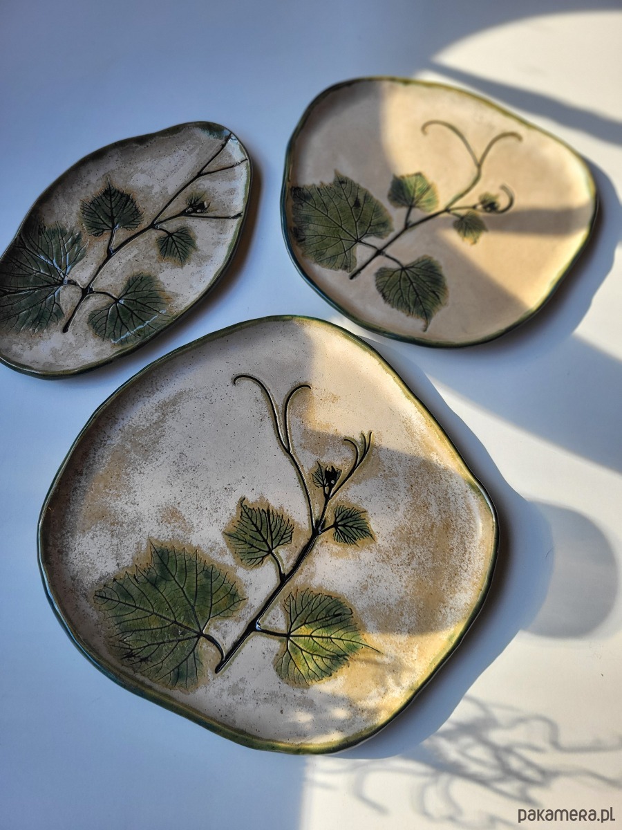 Ręcznie formowane ceramiczne talerze z motywem winorośli.