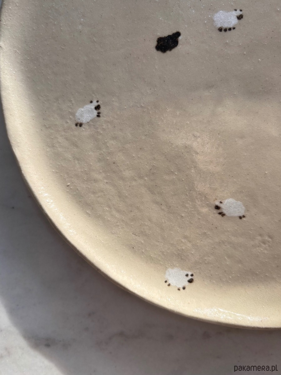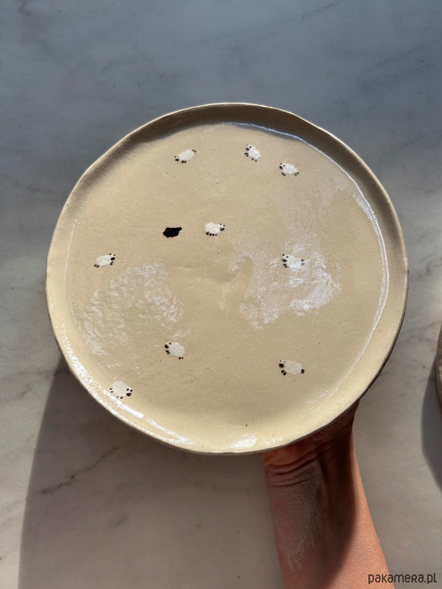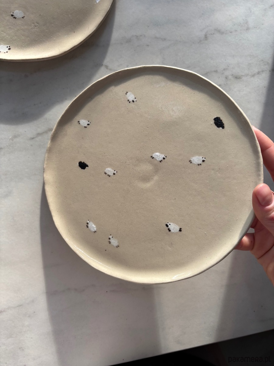 Zestaw ręcznie wykonanych ceramicznych talerzy śniadaniowych o skandynawskim charakterze w owieczki, nawiązujące do polskich gór.