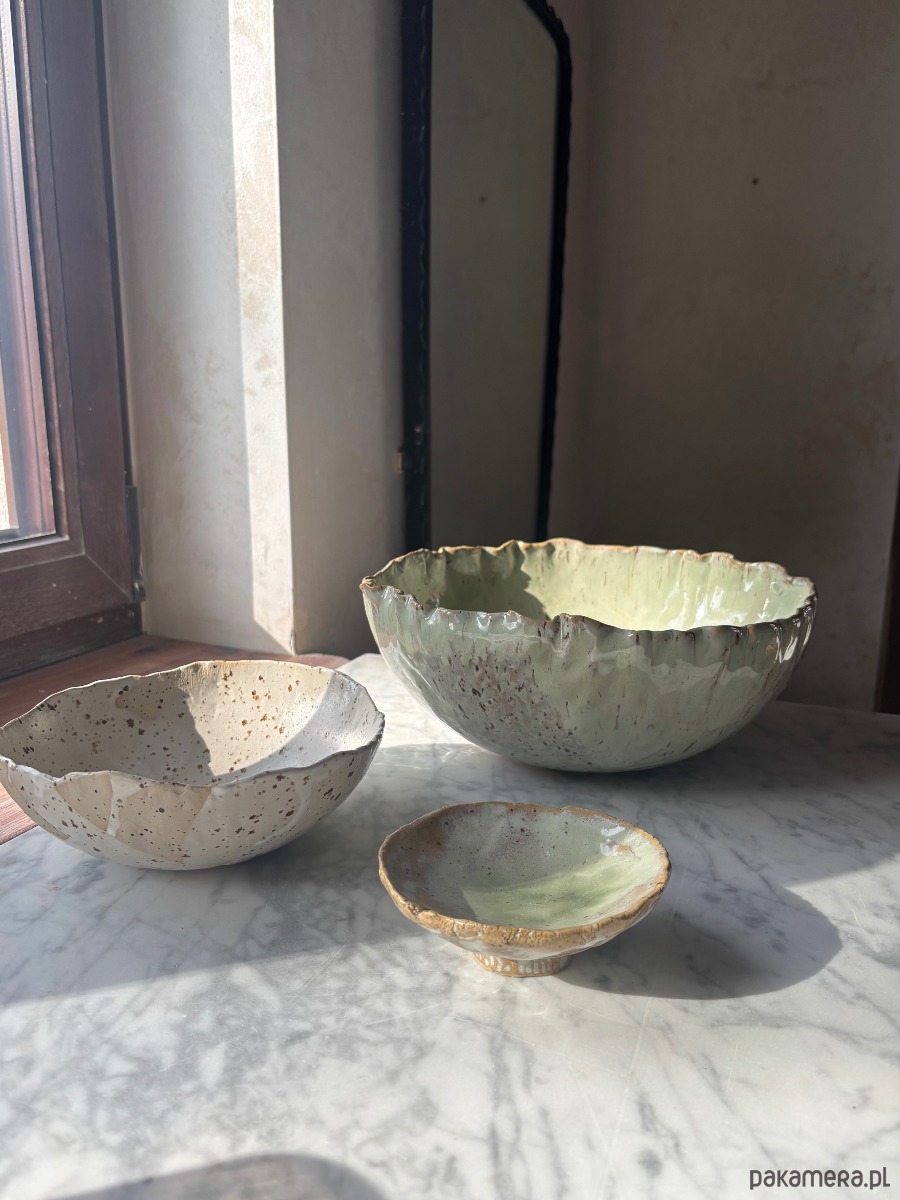 Each piece is made from different types of clay and glazed using various techniques; however, together they form a cohesive composition that brings harmony and freshness into any interior.