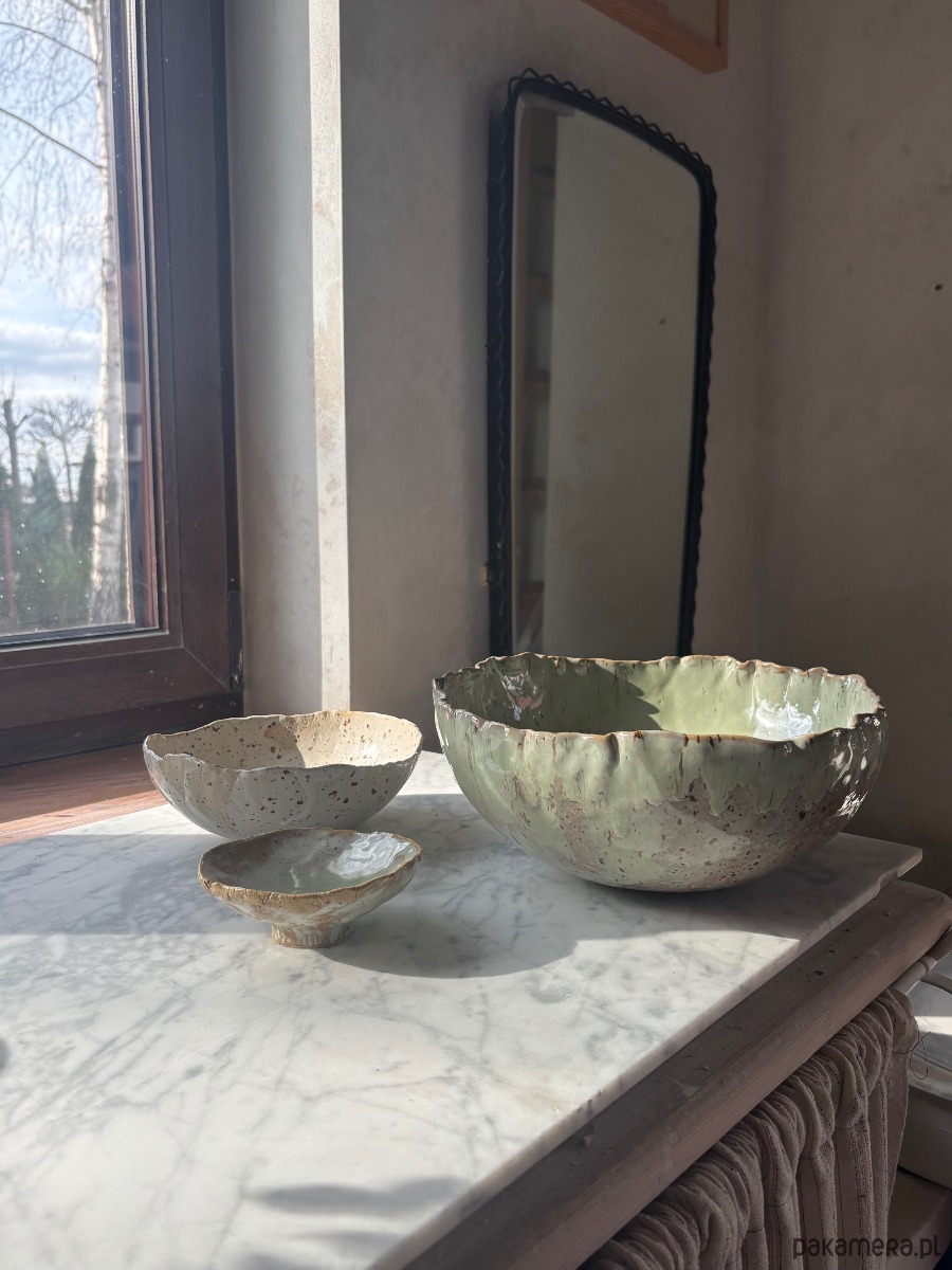 Przedmioty są wykonany z różnych rodzajów glin i szkliwione w różnych technikach, jednak całość tworzy bardzo spójną całość, która wprowadza do wnętrza harmonię i świeżość.