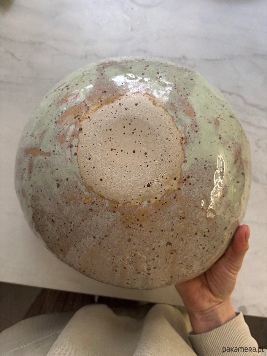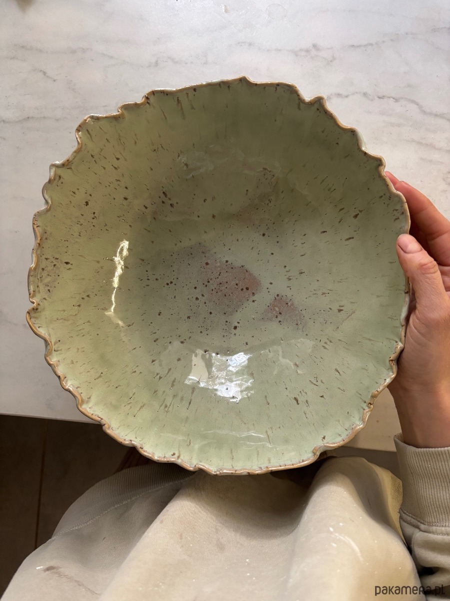 Ręcznie wykonany ceramiczny zestaw składający się z dużej misy na sałaty XXL w szkliwieniu matcha:
